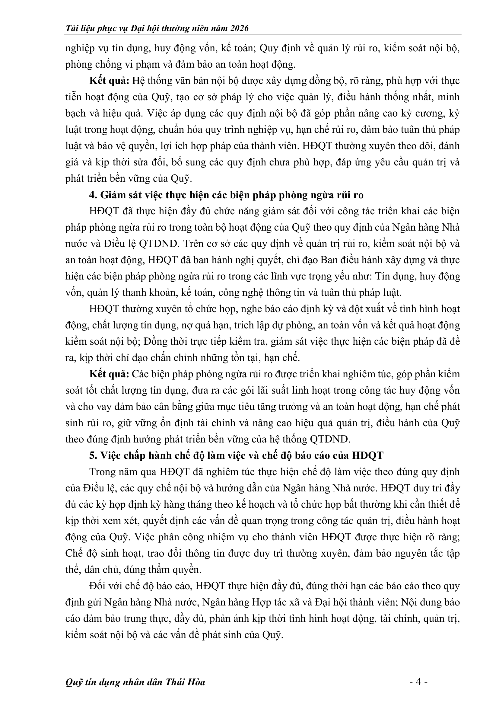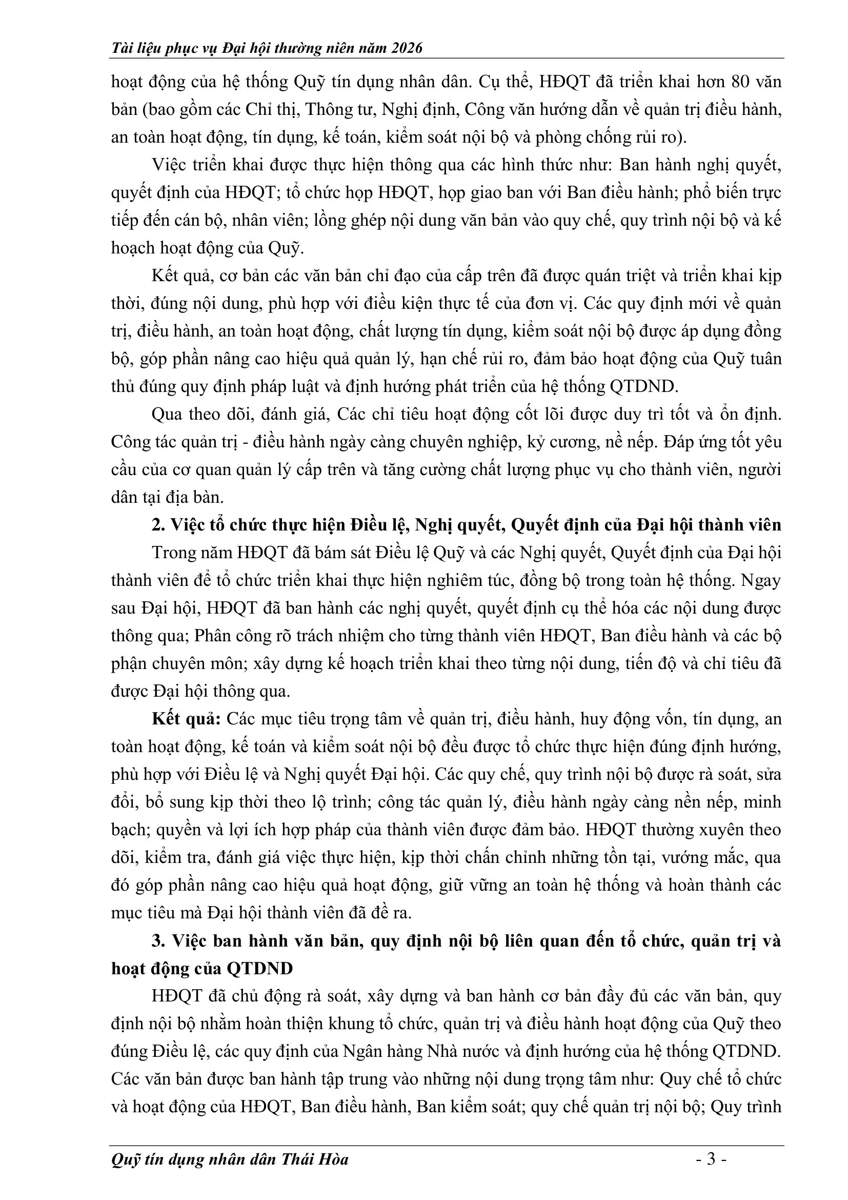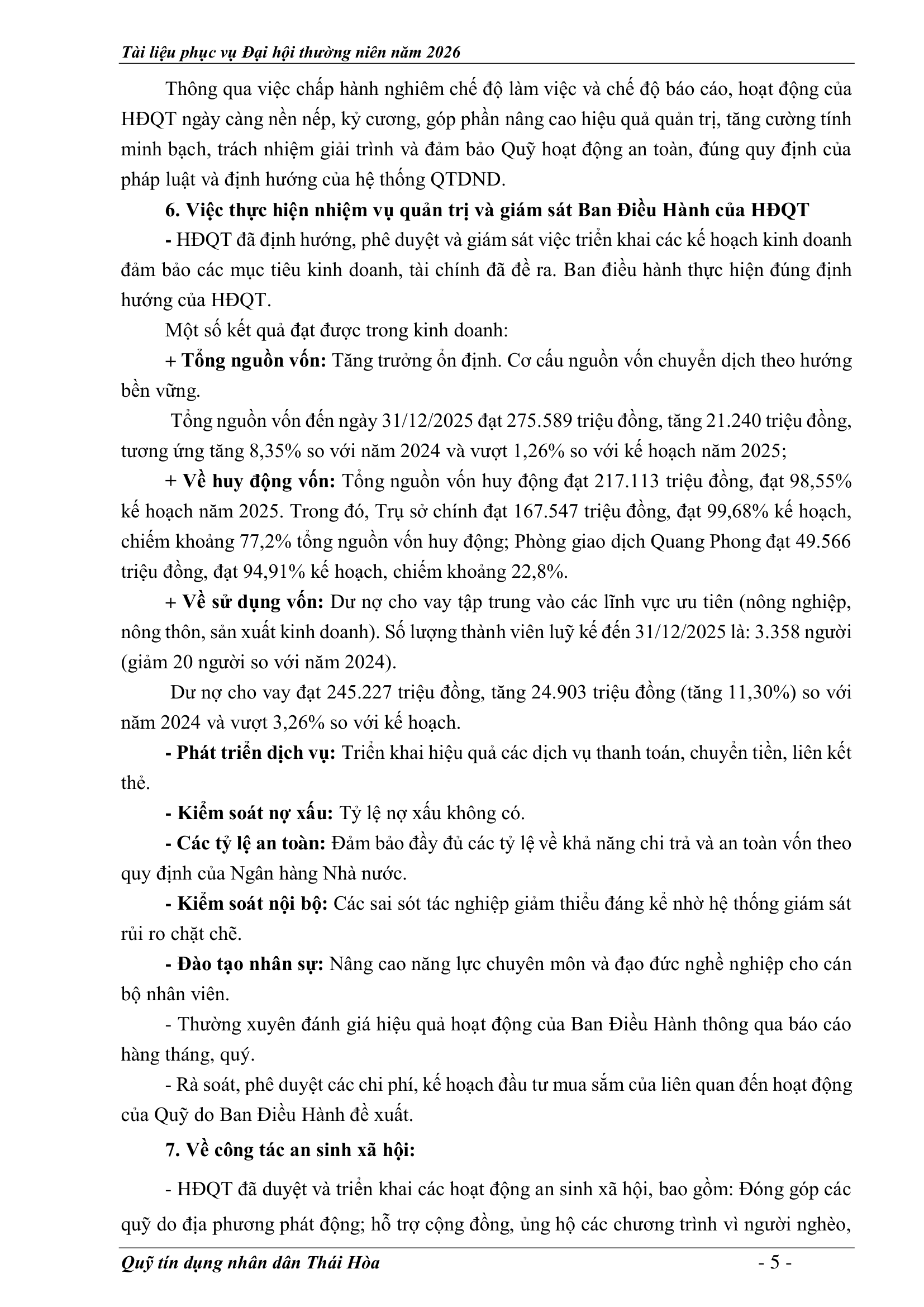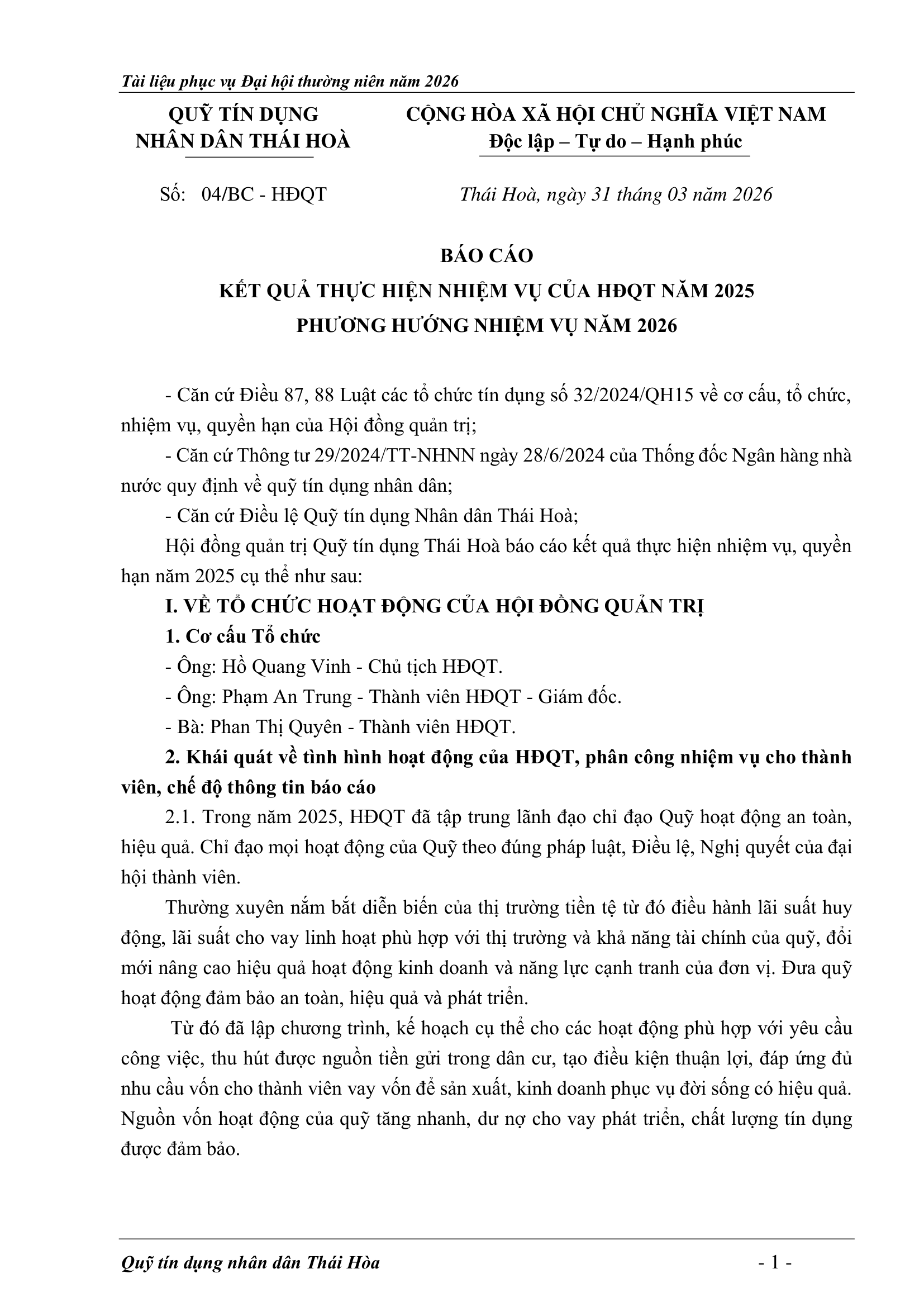 An sinh xã hội, Tin Công Đoàn, Tin khác, Tin tức, sự kiện về QTD, Tư liệu ảnh BÁO CÁO KẾT QUẢ THỰC HIỆN NHIỆM VỤ CỦA HĐQT NĂM 2025 – PHƯƠNG HƯỚNG NHIỆM VỤ NĂM 2026 Posted on 2 Tháng 4, 20262 Tháng 4, 2026 by Nguyên Hoàng | Admin 02 Th4 Số lượt xem: 5 06 QUỸ TÍN DỤNG NHÂN DÂN THÁI HÒA Trụ sở chính: Đường Trần Hưng Đạo, khối Tân Phú, phường Thái Hòa, tỉnh Nghệ An. Phòng giao dịch Quang Phong: Khối Chế Biến Lâm Sản 1, phường Thái Hòa, tỉnh Nghệ An. Theo dõi fanpage Bài viết mới nhất CHƯƠNG TRÌNH, NỘI QUY ĐẠI HỘI ĐẠI BIỂU THÀNH VIÊN THƯỜNG NIÊN 2026 Tài liệu phục vụ cho Đại hội Đại biểu thành viên 2026[...] 02 Th4 TỜ TRÌNH TẠI ĐẠI HỘI ĐẠI BIỂU THÀNH VIÊN THƯỜNG NIÊN 2026 Tài liệu phục vụ cho Đại hội Đại biểu thành viên 2026[...] 02 Th4 BÁO CÁO TỔNG KẾT CÔNG TÁC KIỂM SOÁT NĂM 2025 VÀ PHƯƠNG HƯỚNG NHIỆM VỤ NĂM 2026 Tài liệu phục vụ cho Đại hội Đại biểu thành viên 2026[...] 02 Th4 BÁO CÁO CÔNG TÁC TÀI CHÍNH – KẾ TOÁN NĂM 2025, KẾ HOẠCH NĂM 2026 Tài liệu phục vụ cho Đại hội Đại biểu thành viên 2026[...] 02 Th4 BÁO CÁO TỔNG KẾT HOẠT ĐỘNG NĂM 2025 – PHƯƠNG HƯỚNG NHIỆM VỤ HOẠT ĐỘNG 2026 Tài liệu phục vụ cho Đại hội Đại biểu thành viên 2026[...] 02 Th4 BÁO CÁO KẾT QUẢ THỰC HIỆN NHIỆM VỤ CỦA HĐQT NĂM 2025 – PHƯƠNG HƯỚNG NHIỆM VỤ NĂM 2026 Tài liệu phục vụ cho Đại hội Đại biểu thành viên 2026[...] 02 Th4 Quỹ tín dụng Nhân dân Thái Hòa tích cực tuyên truyền hưởng ứng Ngày bầu cử Quốc hội khóa XVI và HĐND các cấp Số lượt xem: 226 Hướng tới Ngày bầu cử Đại biểu Quốc hội khóa XVI[...] 12 Th3 QUỸ TÍN DỤNG NHÂN DÂN THÁI HÒA ÁP DỤNG GÓI LÃI SUẤT TIẾT KIỆM MỚI CAO NHẤT THỊ TRƯỜNG – LÊN ĐẾN 𝟕,𝟓%/NĂM Số lượt xem: 310 QUỸ TÍN DỤNG NHÂN DÂN THÁI HÒA ÁP DỤNG GÓI LÃI[...] 08 Th3 Quỹ Tín dụng Nhân dân Thái Hòa hưởng ứng Tuần lễ Áo dài Việt Nam chào mừng Ngày Quốc tế Phụ nữ 08/3 Số lượt xem: 185 Chuyên mục: Tuyên truyền – Hoạt động đoàn thểNgày đăng: 08/03/2026Tác[...] 06 Th3 🌸 KHỞI ĐẦU XUÂN NĂM MỚI 2026: QUỸ TÍN DỤNG NHÂN DÂN THÁI HÒA TRIỂN KHAI NHIỀU ƯU ĐÃI HẤP DẪN Số lượt xem: 322 Bước sang Xuân Bính Ngọ 2026 với khí thế mới và[...] 23 Th2 THÔNG BÁO LỊCH NGHỈ TẾT NGUYÊN ĐÁN 2026 Số lượt xem: 213 📢 THÔNG BÁO LỊCH NGHỈ TẾT NGUYÊN ĐÁN 2026 🧧 Quỹ[...] 10 Th2 NGÂN HÀNG HỢP TÁC XÃ CHI NHÁNH NGHỆ AN ĐẾN THĂM, CHÚC TẾT QUỸ TÍN DỤNG NHÂN DÂN THÁI HÒA Số lượt xem: 311 🌸 NGÂN HÀNG HỢP TÁC XÃ CHI NHÁNH NGHỆ AN ĐẾN[...] 02 Th2 Chia sẻ Nguyên Hoàng | Admin Quỹ tín dụng Nhân dân Thái Hòa tích cực tuyên truyền hưởng ứng Ngày bầu cử Quốc hội khóa XVI và HĐND các cấp BÁO CÁO TỔNG KẾT HOẠT ĐỘNG NĂM 2025 – PHƯƠNG HƯỚNG NHIỆM VỤ HOẠT ĐỘNG 2026