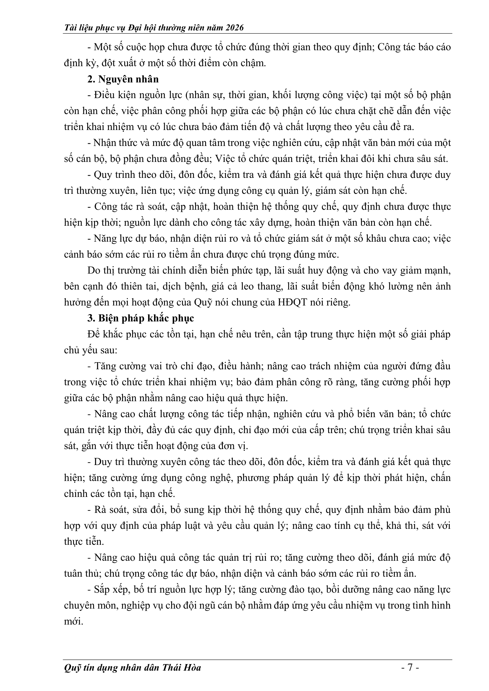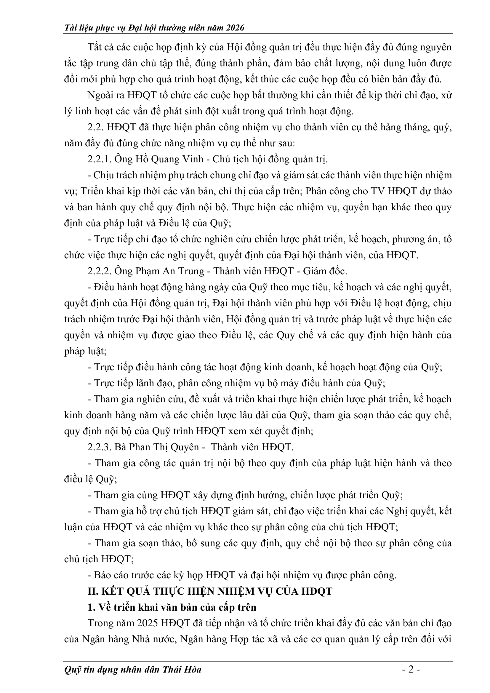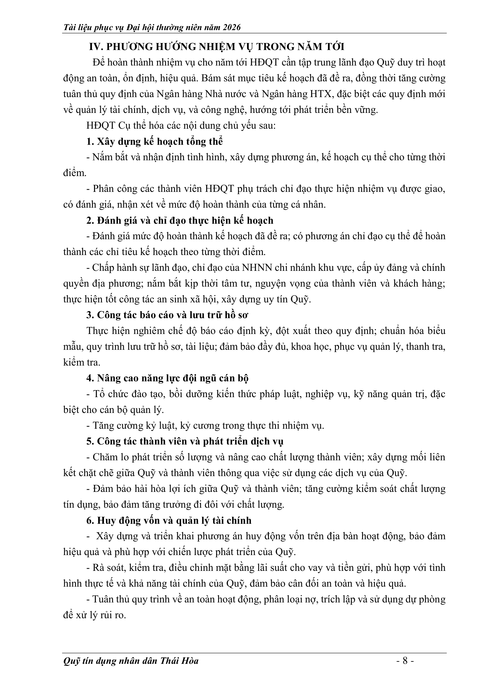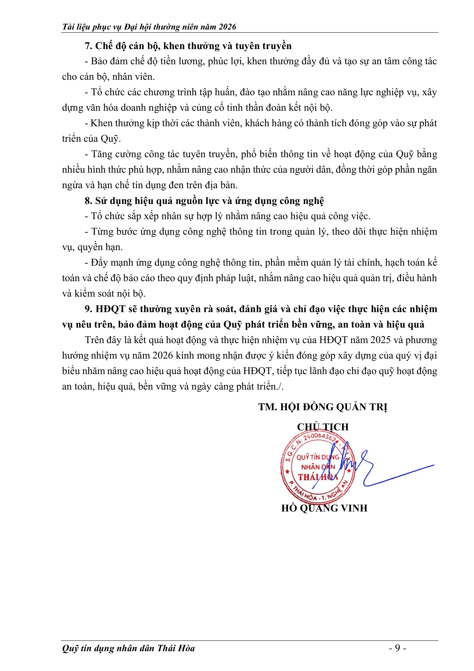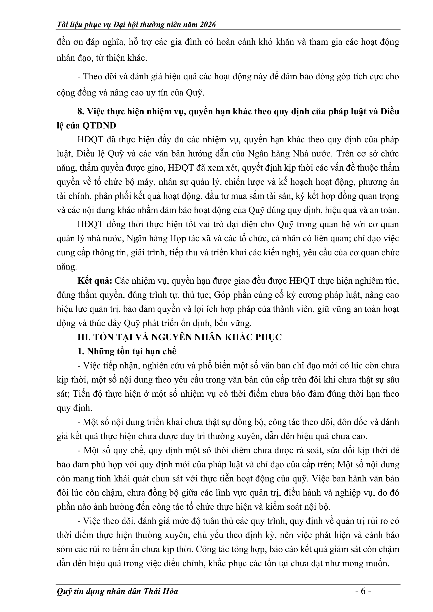 An sinh xã hội, Tin Công Đoàn, Tin khác, Tin tức, sự kiện về QTD, Tư liệu ảnh BÁO CÁO KẾT QUẢ THỰC HIỆN NHIỆM VỤ CỦA HĐQT NĂM 2025 – PHƯƠNG HƯỚNG NHIỆM VỤ NĂM 2026 Posted on 2 Tháng 4, 20262 Tháng 4, 2026 by Nguyên Hoàng | Admin 02 Th4 Số lượt xem: 5 06 QUỸ TÍN DỤNG NHÂN DÂN THÁI HÒA Trụ sở chính: Đường Trần Hưng Đạo, khối Tân Phú, phường Thái Hòa, tỉnh Nghệ An. Phòng giao dịch Quang Phong: Khối Chế Biến Lâm Sản 1, phường Thái Hòa, tỉnh Nghệ An. Theo dõi fanpage Bài viết mới nhất CHƯƠNG TRÌNH, NỘI QUY ĐẠI HỘI ĐẠI BIỂU THÀNH VIÊN THƯỜNG NIÊN 2026 Tài liệu phục vụ cho Đại hội Đại biểu thành viên 2026[...] 02 Th4 TỜ TRÌNH TẠI ĐẠI HỘI ĐẠI BIỂU THÀNH VIÊN THƯỜNG NIÊN 2026 Tài liệu phục vụ cho Đại hội Đại biểu thành viên 2026[...] 02 Th4 BÁO CÁO TỔNG KẾT CÔNG TÁC KIỂM SOÁT NĂM 2025 VÀ PHƯƠNG HƯỚNG NHIỆM VỤ NĂM 2026 Tài liệu phục vụ cho Đại hội Đại biểu thành viên 2026[...] 02 Th4 BÁO CÁO CÔNG TÁC TÀI CHÍNH – KẾ TOÁN NĂM 2025, KẾ HOẠCH NĂM 2026 Tài liệu phục vụ cho Đại hội Đại biểu thành viên 2026[...] 02 Th4 BÁO CÁO TỔNG KẾT HOẠT ĐỘNG NĂM 2025 – PHƯƠNG HƯỚNG NHIỆM VỤ HOẠT ĐỘNG 2026 Tài liệu phục vụ cho Đại hội Đại biểu thành viên 2026[...] 02 Th4 BÁO CÁO KẾT QUẢ THỰC HIỆN NHIỆM VỤ CỦA HĐQT NĂM 2025 – PHƯƠNG HƯỚNG NHIỆM VỤ NĂM 2026 Tài liệu phục vụ cho Đại hội Đại biểu thành viên 2026[...] 02 Th4 Quỹ tín dụng Nhân dân Thái Hòa tích cực tuyên truyền hưởng ứng Ngày bầu cử Quốc hội khóa XVI và HĐND các cấp Số lượt xem: 226 Hướng tới Ngày bầu cử Đại biểu Quốc hội khóa XVI[...] 12 Th3 QUỸ TÍN DỤNG NHÂN DÂN THÁI HÒA ÁP DỤNG GÓI LÃI SUẤT TIẾT KIỆM MỚI CAO NHẤT THỊ TRƯỜNG – LÊN ĐẾN 𝟕,𝟓%/NĂM Số lượt xem: 310 QUỸ TÍN DỤNG NHÂN DÂN THÁI HÒA ÁP DỤNG GÓI LÃI[...] 08 Th3 Quỹ Tín dụng Nhân dân Thái Hòa hưởng ứng Tuần lễ Áo dài Việt Nam chào mừng Ngày Quốc tế Phụ nữ 08/3 Số lượt xem: 185 Chuyên mục: Tuyên truyền – Hoạt động đoàn thểNgày đăng: 08/03/2026Tác[...] 06 Th3 🌸 KHỞI ĐẦU XUÂN NĂM MỚI 2026: QUỸ TÍN DỤNG NHÂN DÂN THÁI HÒA TRIỂN KHAI NHIỀU ƯU ĐÃI HẤP DẪN Số lượt xem: 322 Bước sang Xuân Bính Ngọ 2026 với khí thế mới và[...] 23 Th2 THÔNG BÁO LỊCH NGHỈ TẾT NGUYÊN ĐÁN 2026 Số lượt xem: 213 📢 THÔNG BÁO LỊCH NGHỈ TẾT NGUYÊN ĐÁN 2026 🧧 Quỹ[...] 10 Th2 NGÂN HÀNG HỢP TÁC XÃ CHI NHÁNH NGHỆ AN ĐẾN THĂM, CHÚC TẾT QUỸ TÍN DỤNG NHÂN DÂN THÁI HÒA Số lượt xem: 311 🌸 NGÂN HÀNG HỢP TÁC XÃ CHI NHÁNH NGHỆ AN ĐẾN[...] 02 Th2 Chia sẻ Nguyên Hoàng | Admin Quỹ tín dụng Nhân dân Thái Hòa tích cực tuyên truyền hưởng ứng Ngày bầu cử Quốc hội khóa XVI và HĐND các cấp BÁO CÁO TỔNG KẾT HOẠT ĐỘNG NĂM 2025 – PHƯƠNG HƯỚNG NHIỆM VỤ HOẠT ĐỘNG 2026