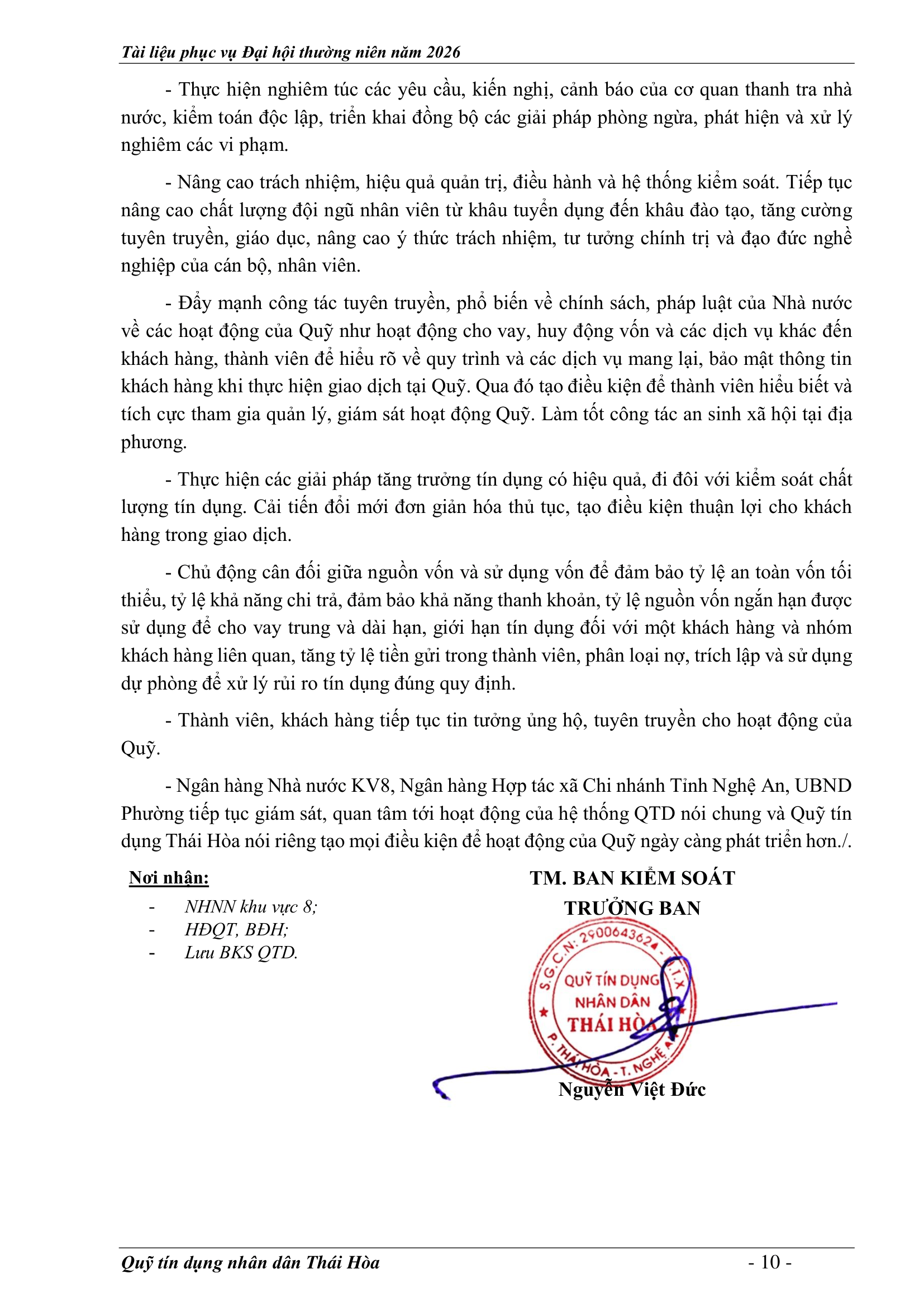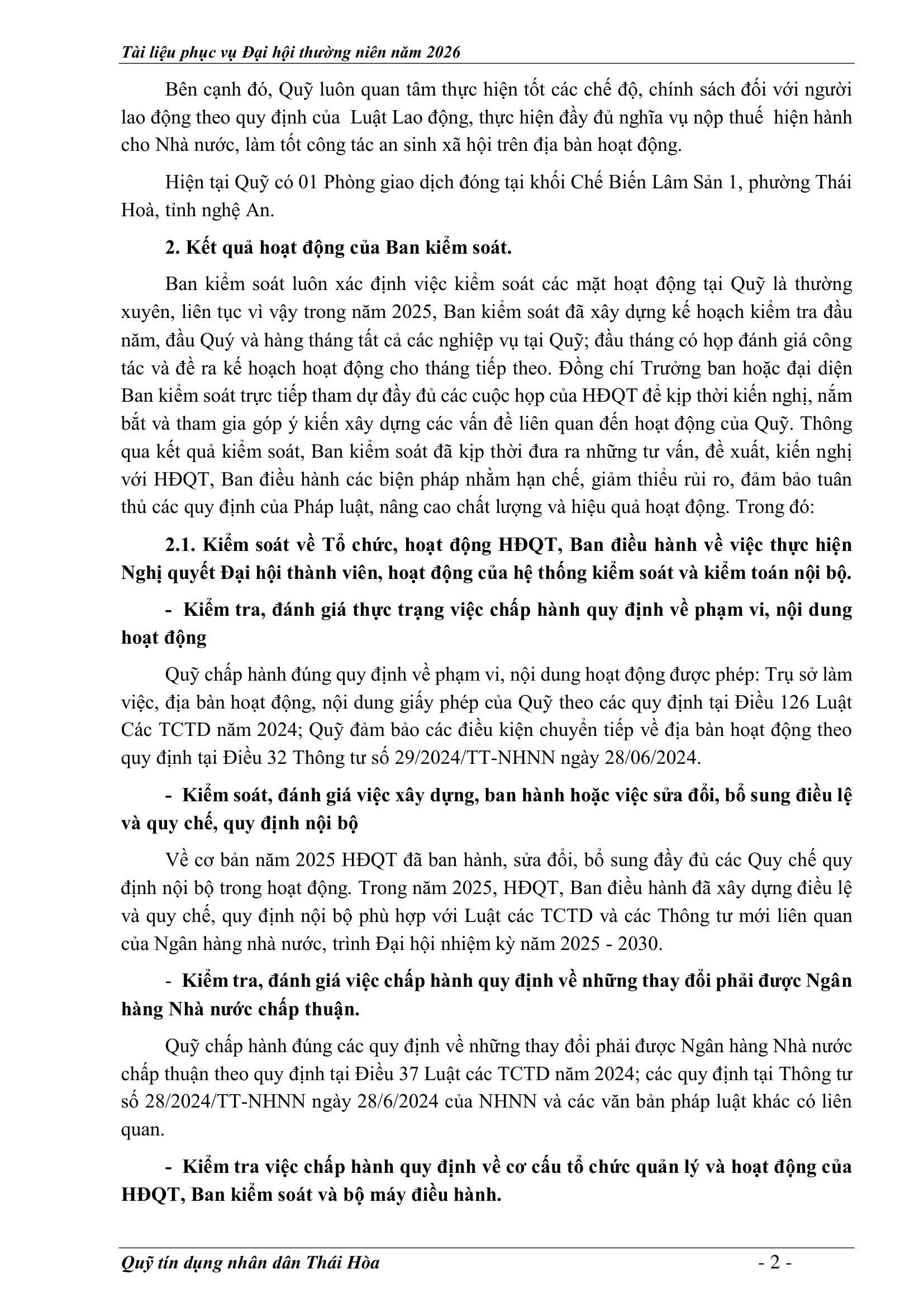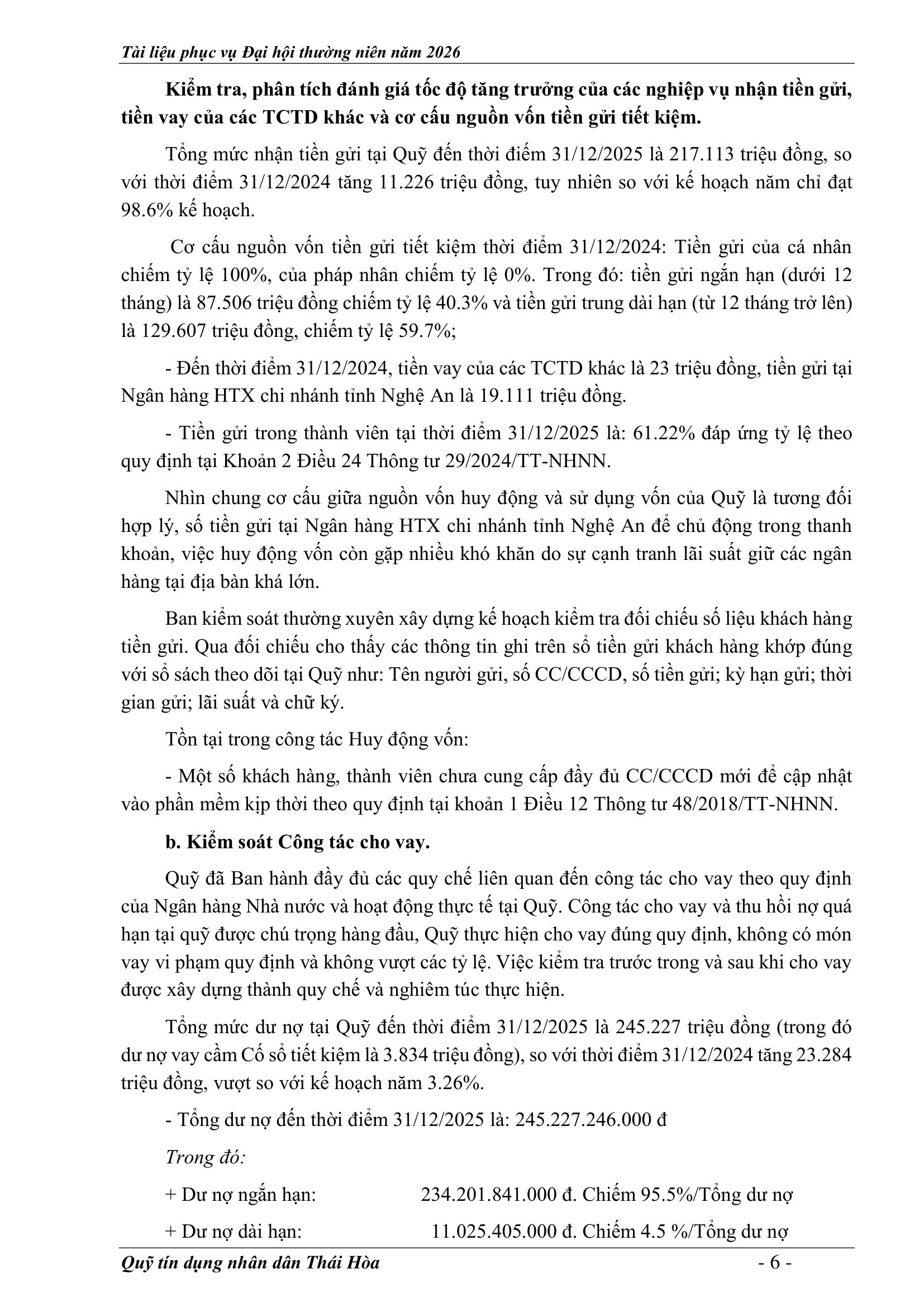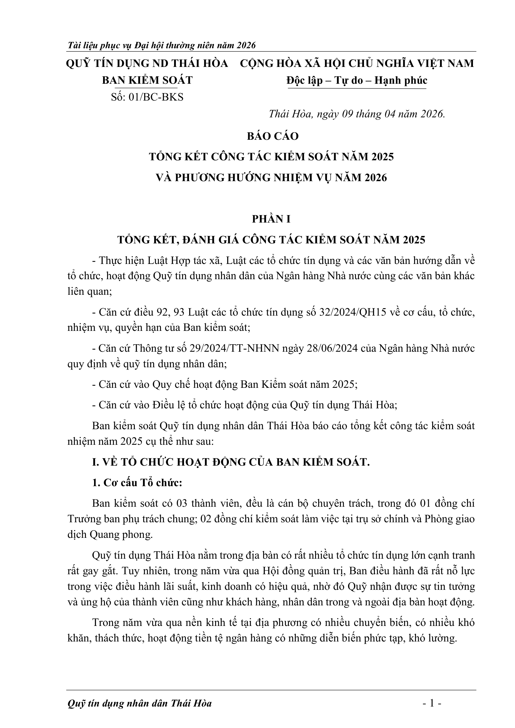 An sinh xã hội, Tin Công Đoàn, Tin khác, Tin tức, sự kiện về QTD, Tư liệu ảnh BÁO CÁO TỔNG KẾT CÔNG TÁC KIỂM SOÁT NĂM 2025 VÀ PHƯƠNG HƯỚNG NHIỆM VỤ NĂM 2026 Posted on 2 Tháng 4, 20262 Tháng 4, 2026 by Nguyên Hoàng | Admin 02 Th4 Số lượt xem: 4 QUỸ TÍN DỤNG NHÂN DÂN THÁI HÒA Trụ sở chính: Đường Trần Hưng Đạo, khối Tân Phú, phường Hòa Hiếu, thị xã Thái Hòa, tỉnh Nghệ An. Phòng giao dịch Quang Phong: Khối Chế Biến Lâm Sản 1, phường Quang Phong, thị xã Thái Hòa, tỉnh Nghệ An. Theo dõi fanpage Bài viết mới nhất CHƯƠNG TRÌNH, NỘI QUY ĐẠI HỘI ĐẠI BIỂU THÀNH VIÊN THƯỜNG NIÊN 2026 Tài liệu phục vụ cho Đại hội Đại biểu thành viên 2026[...] 02 Th4 TỜ TRÌNH TẠI ĐẠI HỘI ĐẠI BIỂU THÀNH VIÊN THƯỜNG NIÊN 2026 Tài liệu phục vụ cho Đại hội Đại biểu thành viên 2026[...] 02 Th4 BÁO CÁO TỔNG KẾT CÔNG TÁC KIỂM SOÁT NĂM 2025 VÀ PHƯƠNG HƯỚNG NHIỆM VỤ NĂM 2026 Tài liệu phục vụ cho Đại hội Đại biểu thành viên 2026[...] 02 Th4 BÁO CÁO CÔNG TÁC TÀI CHÍNH – KẾ TOÁN NĂM 2025, KẾ HOẠCH NĂM 2026 Tài liệu phục vụ cho Đại hội Đại biểu thành viên 2026[...] 02 Th4 BÁO CÁO TỔNG KẾT HOẠT ĐỘNG NĂM 2025 – PHƯƠNG HƯỚNG NHIỆM VỤ HOẠT ĐỘNG 2026 Tài liệu phục vụ cho Đại hội Đại biểu thành viên 2026[...] 02 Th4 BÁO CÁO KẾT QUẢ THỰC HIỆN NHIỆM VỤ CỦA HĐQT NĂM 2025 – PHƯƠNG HƯỚNG NHIỆM VỤ NĂM 2026 Tài liệu phục vụ cho Đại hội Đại biểu thành viên 2026[...] 02 Th4 Quỹ tín dụng Nhân dân Thái Hòa tích cực tuyên truyền hưởng ứng Ngày bầu cử Quốc hội khóa XVI và HĐND các cấp Số lượt xem: 225 Hướng tới Ngày bầu cử Đại biểu Quốc hội khóa XVI[...] 12 Th3 QUỸ TÍN DỤNG NHÂN DÂN THÁI HÒA ÁP DỤNG GÓI LÃI SUẤT TIẾT KIỆM MỚI CAO NHẤT THỊ TRƯỜNG – LÊN ĐẾN 𝟕,𝟓%/NĂM Số lượt xem: 309 QUỸ TÍN DỤNG NHÂN DÂN THÁI HÒA ÁP DỤNG GÓI LÃI[...] 08 Th3 Quỹ Tín dụng Nhân dân Thái Hòa hưởng ứng Tuần lễ Áo dài Việt Nam chào mừng Ngày Quốc tế Phụ nữ 08/3 Số lượt xem: 184 Chuyên mục: Tuyên truyền – Hoạt động đoàn thểNgày đăng: 08/03/2026Tác[...] 06 Th3 🌸 KHỞI ĐẦU XUÂN NĂM MỚI 2026: QUỸ TÍN DỤNG NHÂN DÂN THÁI HÒA TRIỂN KHAI NHIỀU ƯU ĐÃI HẤP DẪN Số lượt xem: 321 Bước sang Xuân Bính Ngọ 2026 với khí thế mới và[...] 23 Th2 THÔNG BÁO LỊCH NGHỈ TẾT NGUYÊN ĐÁN 2026 Số lượt xem: 212 📢 THÔNG BÁO LỊCH NGHỈ TẾT NGUYÊN ĐÁN 2026 🧧 Quỹ[...] 10 Th2 NGÂN HÀNG HỢP TÁC XÃ CHI NHÁNH NGHỆ AN ĐẾN THĂM, CHÚC TẾT QUỸ TÍN DỤNG NHÂN DÂN THÁI HÒA Số lượt xem: 310 🌸 NGÂN HÀNG HỢP TÁC XÃ CHI NHÁNH NGHỆ AN ĐẾN[...] 02 Th2 Chia sẻ Nguyên Hoàng | Admin BÁO CÁO CÔNG TÁC TÀI CHÍNH – KẾ TOÁN NĂM 2025, KẾ HOẠCH NĂM 2026 TỜ TRÌNH TẠI ĐẠI HỘI ĐẠI BIỂU THÀNH VIÊN THƯỜNG NIÊN 2026