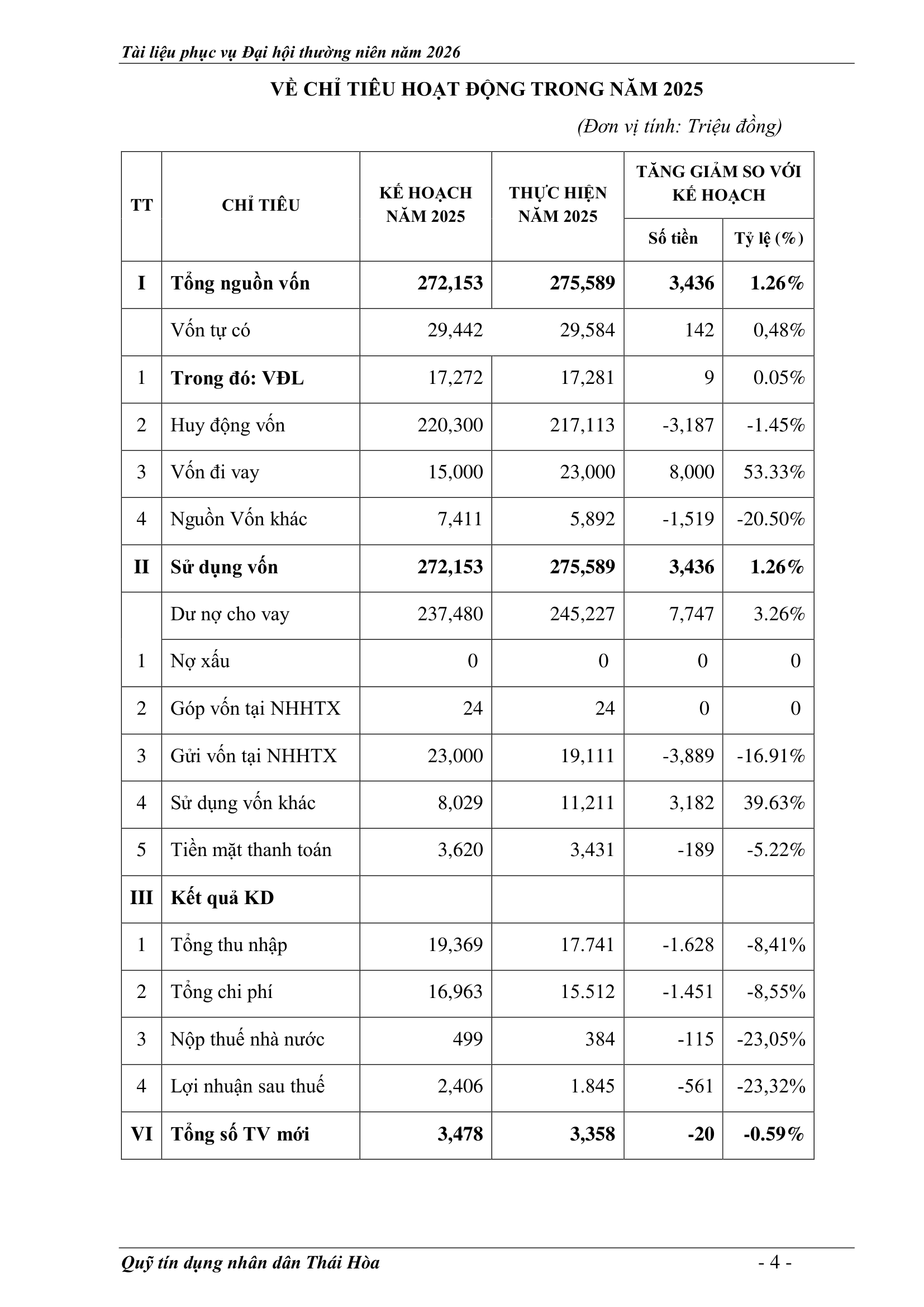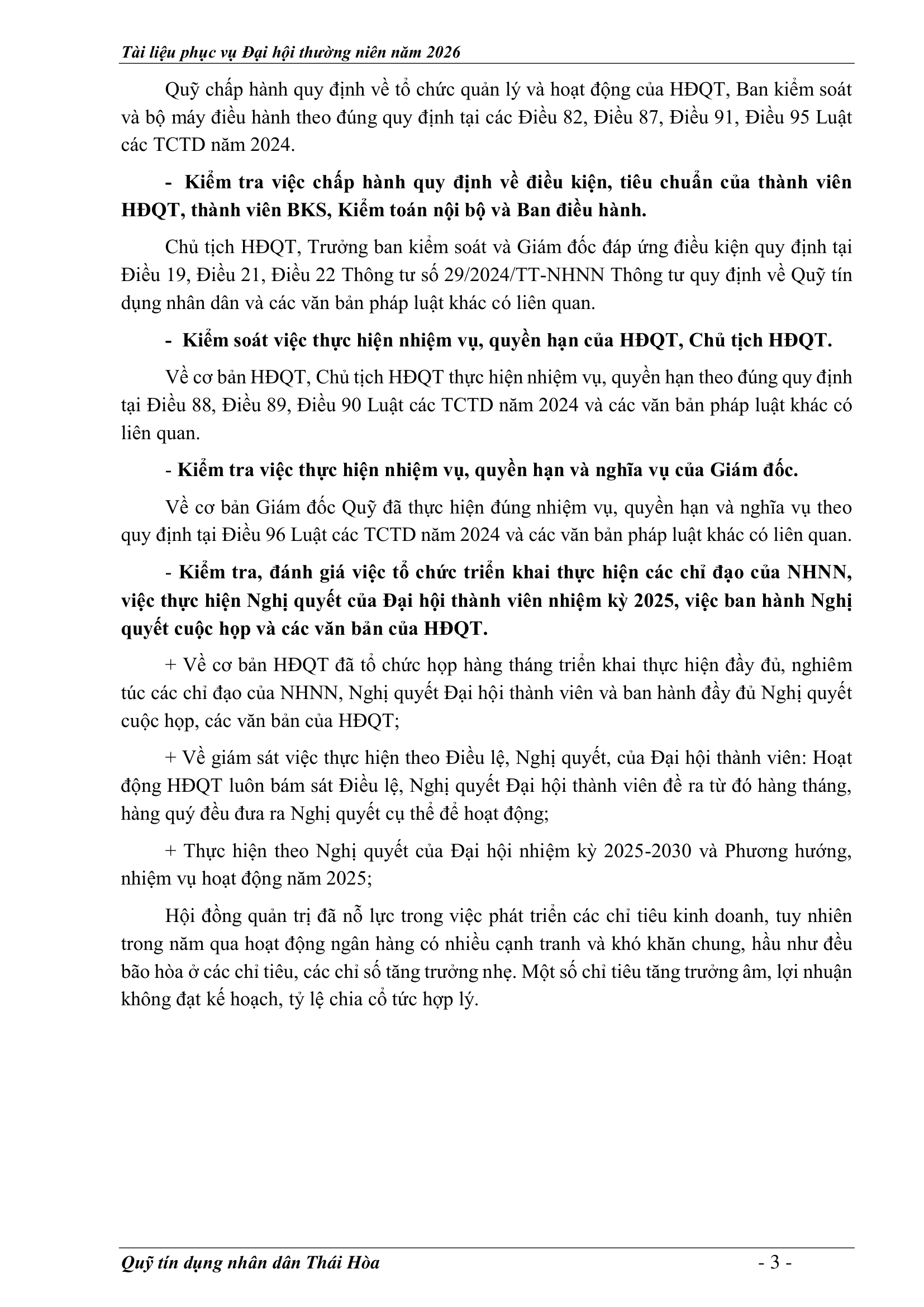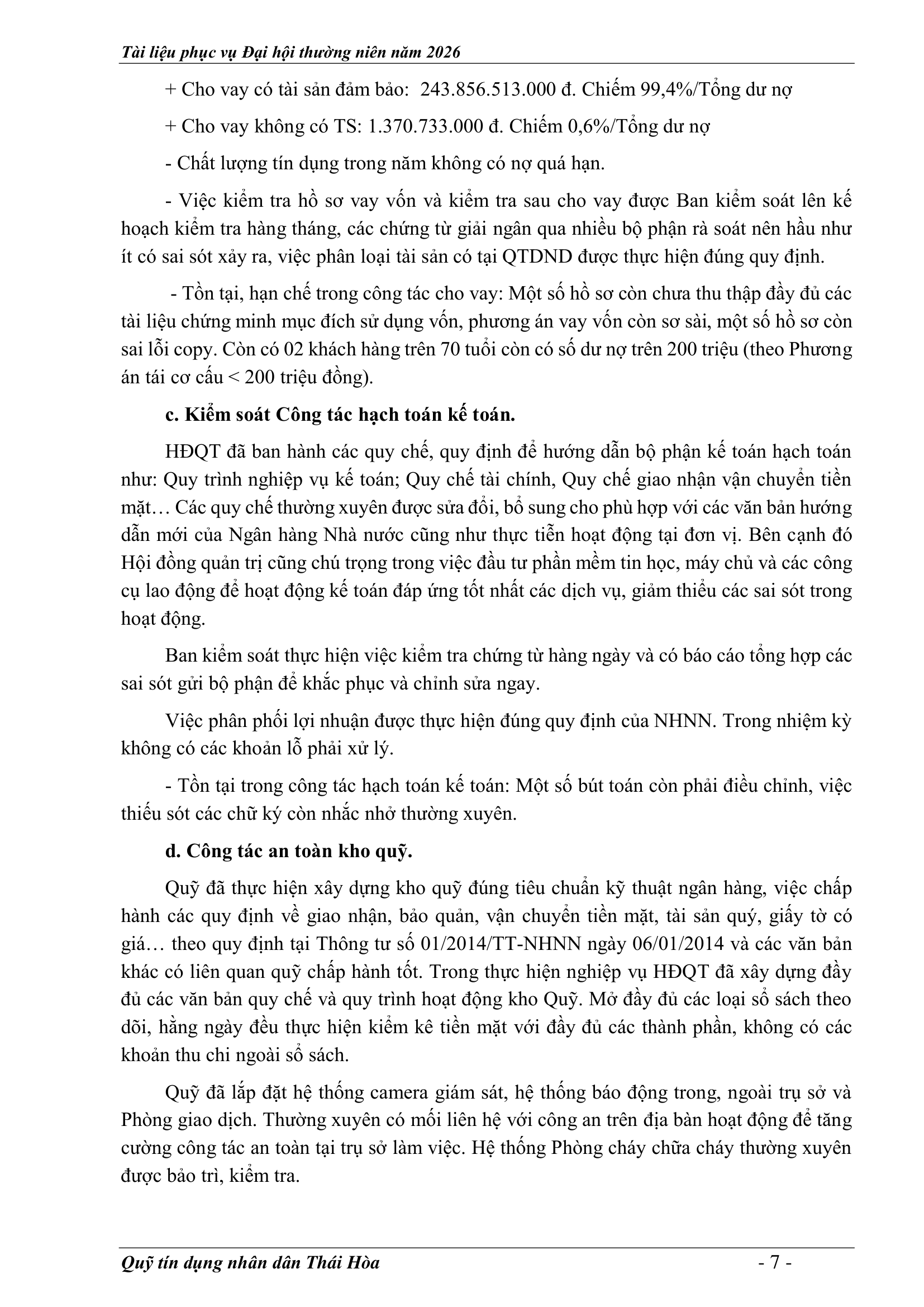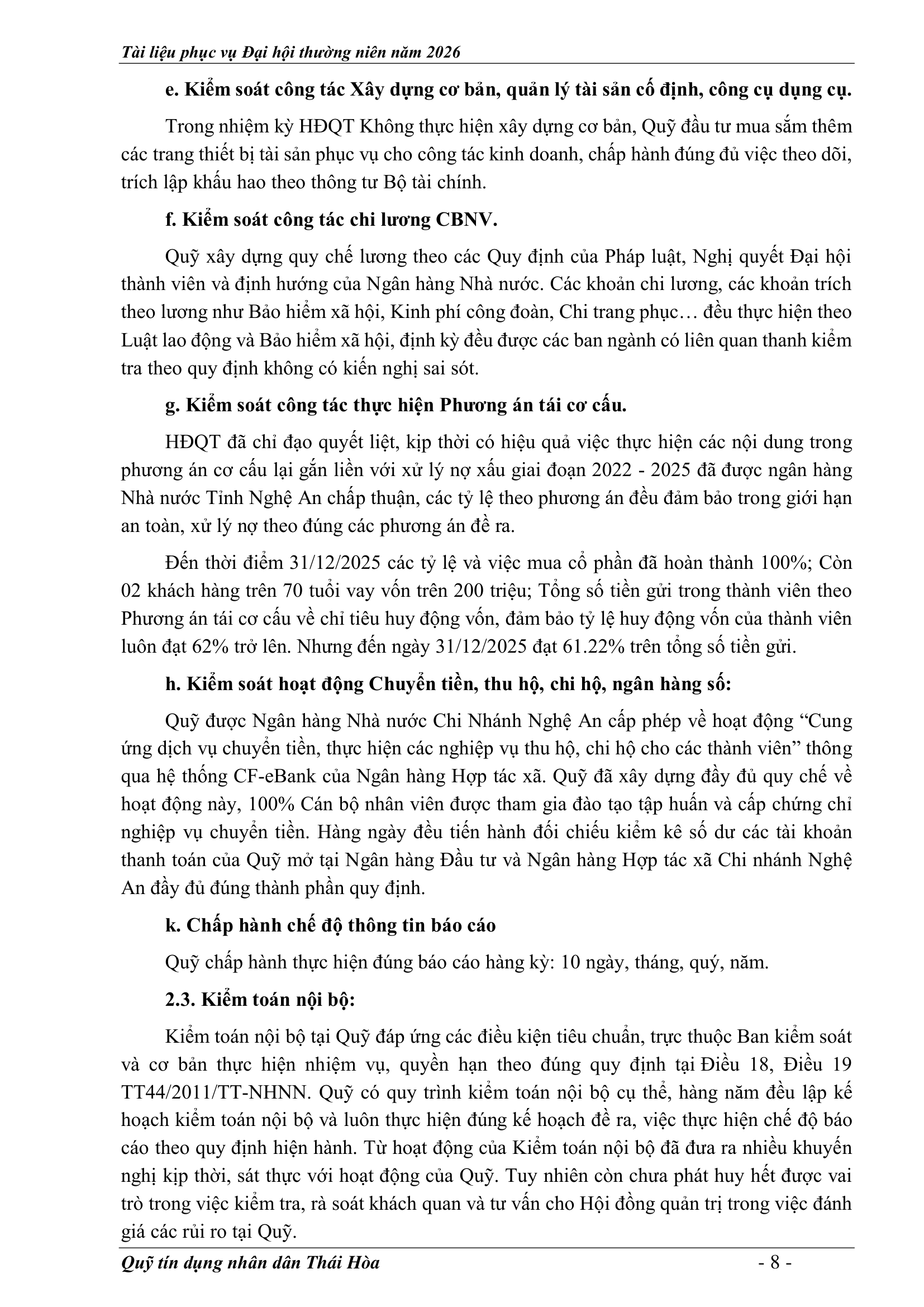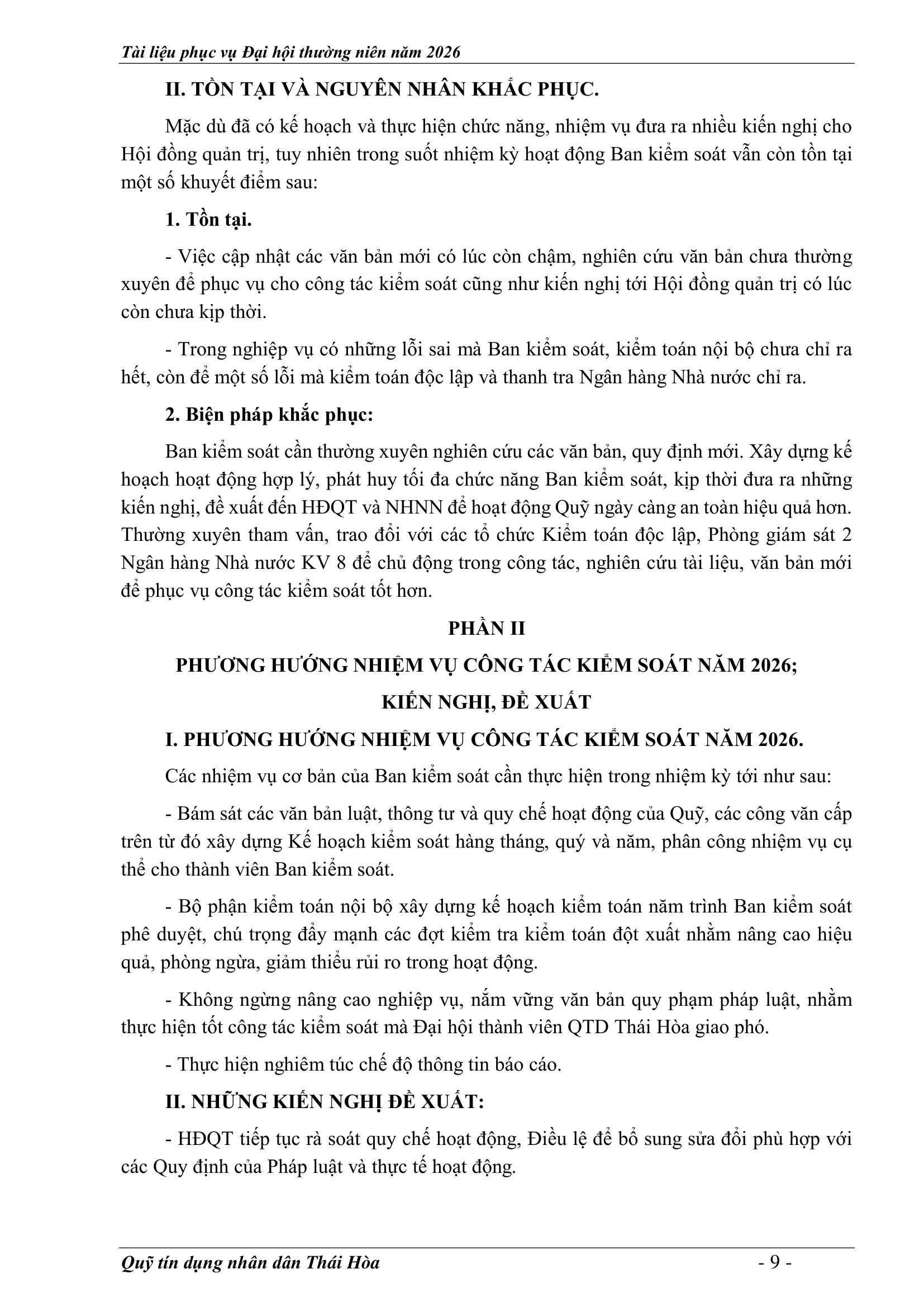 An sinh xã hội, Tin Công Đoàn, Tin khác, Tin tức, sự kiện về QTD, Tư liệu ảnh BÁO CÁO TỔNG KẾT CÔNG TÁC KIỂM SOÁT NĂM 2025 VÀ PHƯƠNG HƯỚNG NHIỆM VỤ NĂM 2026 Posted on 2 Tháng 4, 20262 Tháng 4, 2026 by Nguyên Hoàng | Admin 02 Th4 Số lượt xem: 4 QUỸ TÍN DỤNG NHÂN DÂN THÁI HÒA Trụ sở chính: Đường Trần Hưng Đạo, khối Tân Phú, phường Hòa Hiếu, thị xã Thái Hòa, tỉnh Nghệ An. Phòng giao dịch Quang Phong: Khối Chế Biến Lâm Sản 1, phường Quang Phong, thị xã Thái Hòa, tỉnh Nghệ An. Theo dõi fanpage Bài viết mới nhất CHƯƠNG TRÌNH, NỘI QUY ĐẠI HỘI ĐẠI BIỂU THÀNH VIÊN THƯỜNG NIÊN 2026 Tài liệu phục vụ cho Đại hội Đại biểu thành viên 2026[...] 02 Th4 TỜ TRÌNH TẠI ĐẠI HỘI ĐẠI BIỂU THÀNH VIÊN THƯỜNG NIÊN 2026 Tài liệu phục vụ cho Đại hội Đại biểu thành viên 2026[...] 02 Th4 BÁO CÁO TỔNG KẾT CÔNG TÁC KIỂM SOÁT NĂM 2025 VÀ PHƯƠNG HƯỚNG NHIỆM VỤ NĂM 2026 Tài liệu phục vụ cho Đại hội Đại biểu thành viên 2026[...] 02 Th4 BÁO CÁO CÔNG TÁC TÀI CHÍNH – KẾ TOÁN NĂM 2025, KẾ HOẠCH NĂM 2026 Tài liệu phục vụ cho Đại hội Đại biểu thành viên 2026[...] 02 Th4 BÁO CÁO TỔNG KẾT HOẠT ĐỘNG NĂM 2025 – PHƯƠNG HƯỚNG NHIỆM VỤ HOẠT ĐỘNG 2026 Tài liệu phục vụ cho Đại hội Đại biểu thành viên 2026[...] 02 Th4 BÁO CÁO KẾT QUẢ THỰC HIỆN NHIỆM VỤ CỦA HĐQT NĂM 2025 – PHƯƠNG HƯỚNG NHIỆM VỤ NĂM 2026 Tài liệu phục vụ cho Đại hội Đại biểu thành viên 2026[...] 02 Th4 Quỹ tín dụng Nhân dân Thái Hòa tích cực tuyên truyền hưởng ứng Ngày bầu cử Quốc hội khóa XVI và HĐND các cấp Số lượt xem: 225 Hướng tới Ngày bầu cử Đại biểu Quốc hội khóa XVI[...] 12 Th3 QUỸ TÍN DỤNG NHÂN DÂN THÁI HÒA ÁP DỤNG GÓI LÃI SUẤT TIẾT KIỆM MỚI CAO NHẤT THỊ TRƯỜNG – LÊN ĐẾN 𝟕,𝟓%/NĂM Số lượt xem: 309 QUỸ TÍN DỤNG NHÂN DÂN THÁI HÒA ÁP DỤNG GÓI LÃI[...] 08 Th3 Quỹ Tín dụng Nhân dân Thái Hòa hưởng ứng Tuần lễ Áo dài Việt Nam chào mừng Ngày Quốc tế Phụ nữ 08/3 Số lượt xem: 184 Chuyên mục: Tuyên truyền – Hoạt động đoàn thểNgày đăng: 08/03/2026Tác[...] 06 Th3 🌸 KHỞI ĐẦU XUÂN NĂM MỚI 2026: QUỸ TÍN DỤNG NHÂN DÂN THÁI HÒA TRIỂN KHAI NHIỀU ƯU ĐÃI HẤP DẪN Số lượt xem: 321 Bước sang Xuân Bính Ngọ 2026 với khí thế mới và[...] 23 Th2 THÔNG BÁO LỊCH NGHỈ TẾT NGUYÊN ĐÁN 2026 Số lượt xem: 212 📢 THÔNG BÁO LỊCH NGHỈ TẾT NGUYÊN ĐÁN 2026 🧧 Quỹ[...] 10 Th2 NGÂN HÀNG HỢP TÁC XÃ CHI NHÁNH NGHỆ AN ĐẾN THĂM, CHÚC TẾT QUỸ TÍN DỤNG NHÂN DÂN THÁI HÒA Số lượt xem: 310 🌸 NGÂN HÀNG HỢP TÁC XÃ CHI NHÁNH NGHỆ AN ĐẾN[...] 02 Th2 Chia sẻ Nguyên Hoàng | Admin BÁO CÁO CÔNG TÁC TÀI CHÍNH – KẾ TOÁN NĂM 2025, KẾ HOẠCH NĂM 2026 TỜ TRÌNH TẠI ĐẠI HỘI ĐẠI BIỂU THÀNH VIÊN THƯỜNG NIÊN 2026