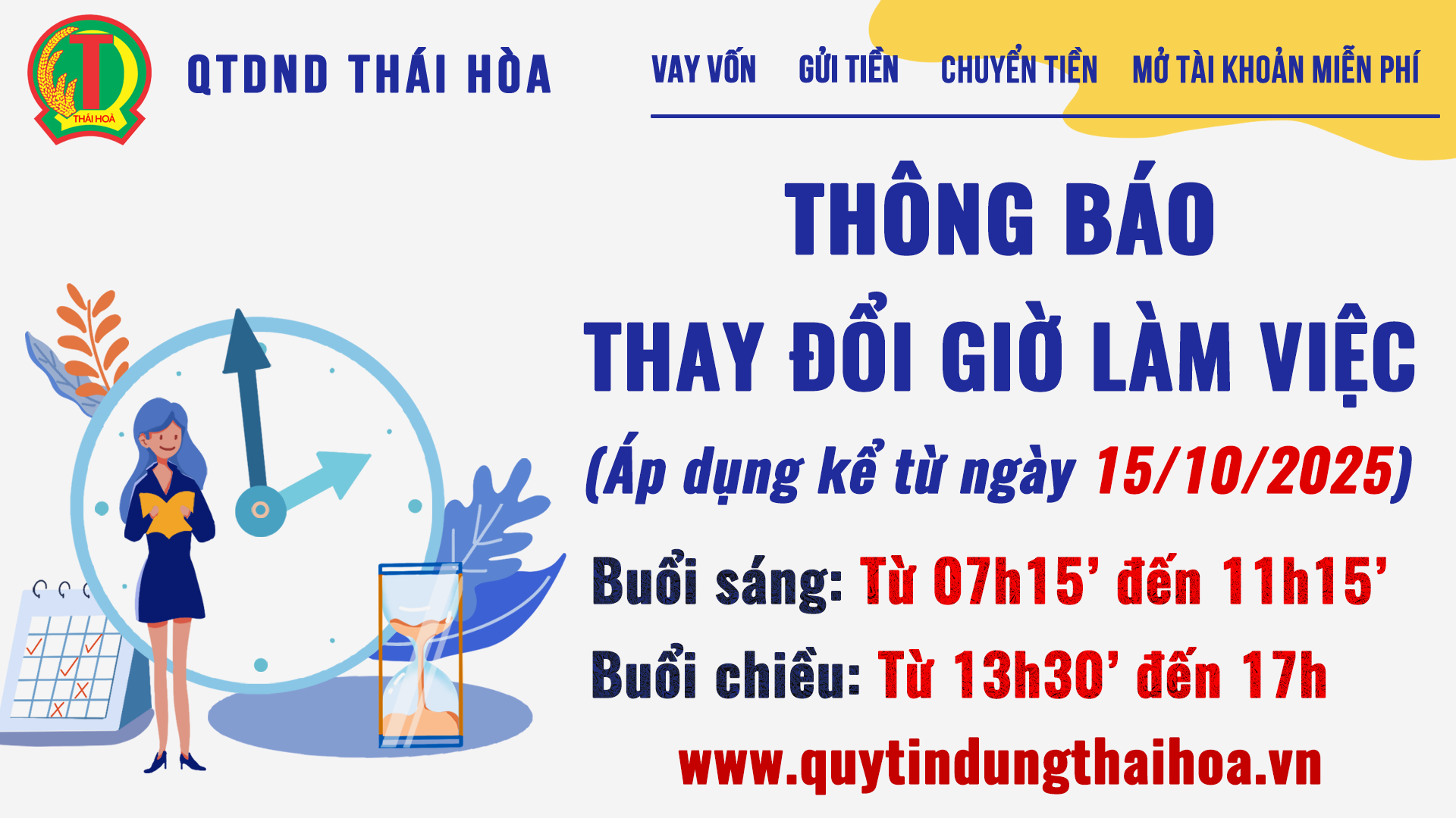 Nhằm phù hợp với điều kiện thời tiết mùa đông, kể từ ngày 15/10/2025, Quỹ tín dụng nhân dân Thái Hòa sẽ áp dụng thời gian làm việc như sau: