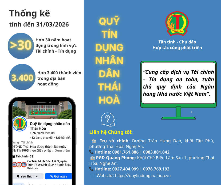 Trong năm 2025, mặc dù còn nhiều khó khăn chung của nền kinh tế, Quỹ tín dụng nhân dân Thái Hòa vẫn duy trì hoạt động ổn định, đảm bảo an toàn và từng bước phát triển cả về quy mô và chất lượng.