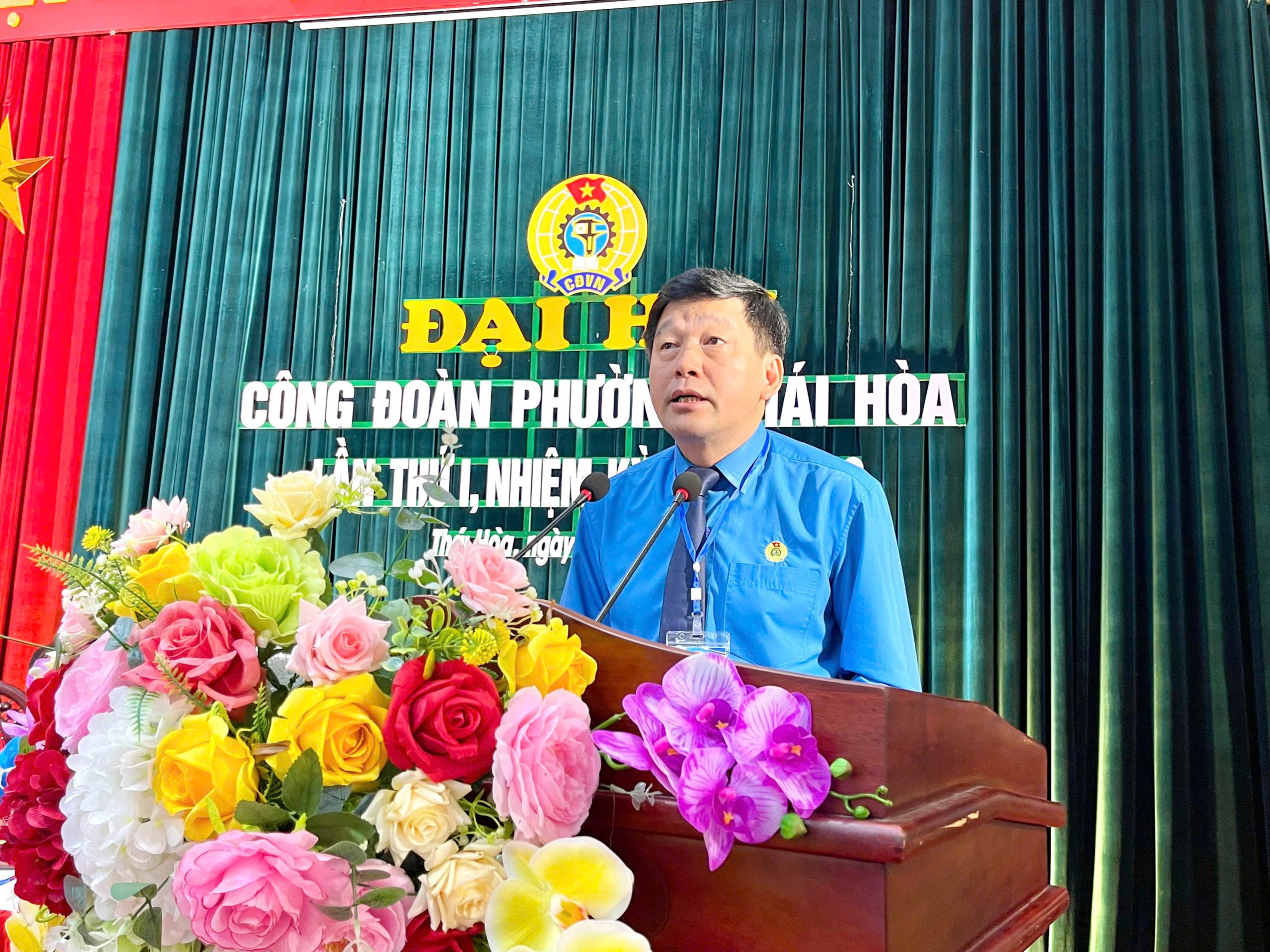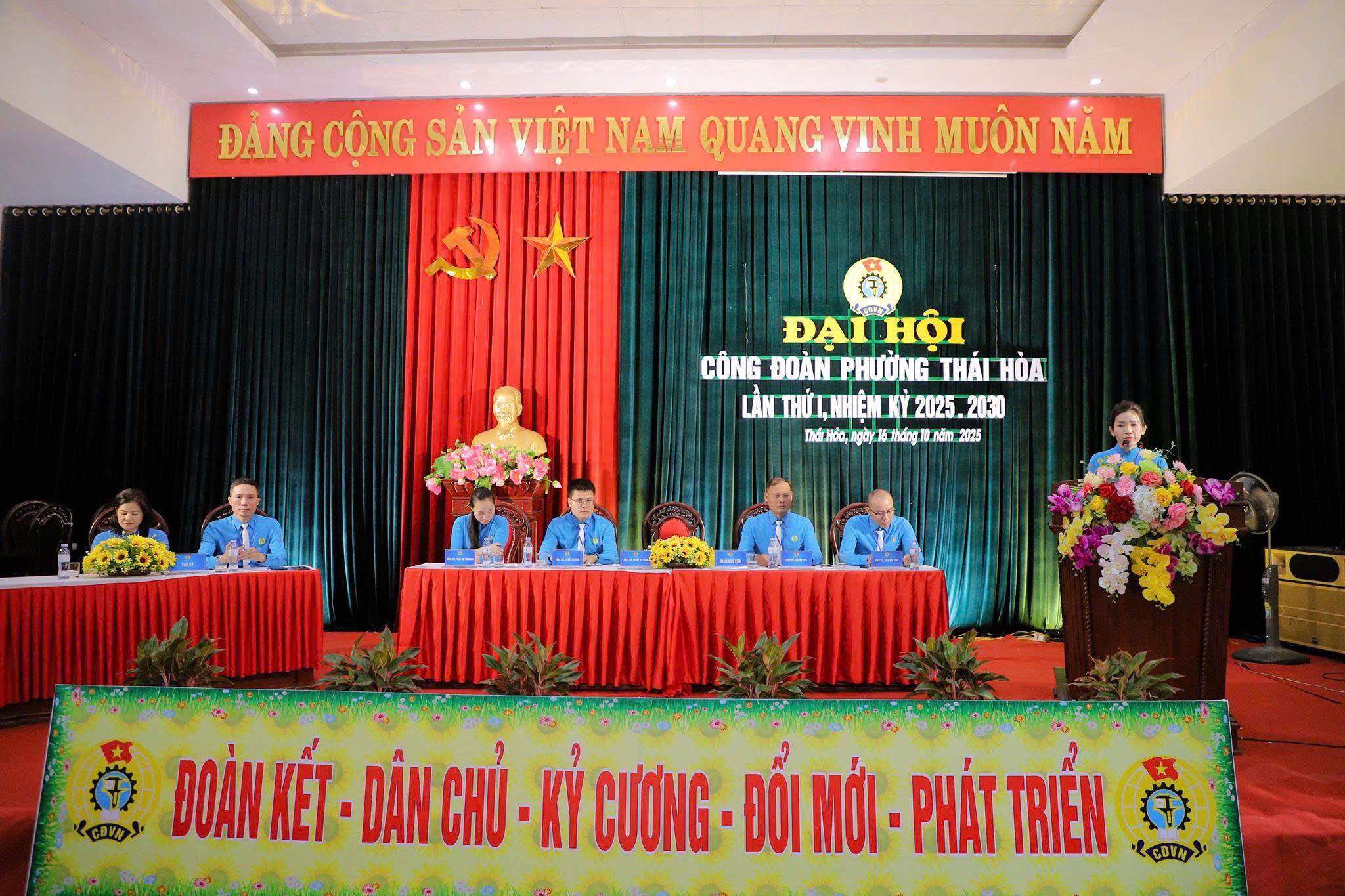 Sáng ngày 16/10/2025, tại Hội trường phường Thái Hòa đã diễn ra Đại hội Công đoàn phường Thái Hòa lần thứ I, nhiệm kỳ 2025–2030. Đây là sự kiện chính trị quan trọng, đánh dấu bước phát triển mới của tổ chức Công đoàn phường trong công tác chăm lo, bảo vệ quyền và lợi ích hợp pháp, chính đáng của đoàn viên và người lao động trên địa bàn