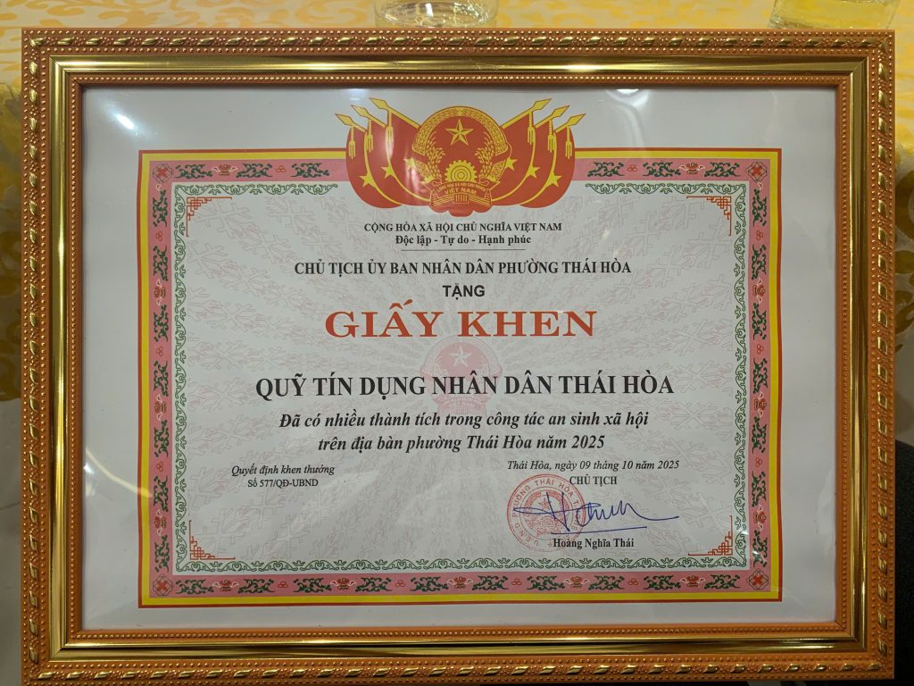 Trong chương trình “Gặp mặt Doanh nghiệp, Doanh nhân phường Thái Hòa nhân kỷ niệm Ngày Doanh nhân Việt Nam 13/10”, Quỹ tín dụng nhân dân Thái Hòa vinh dự được Chủ tịch UBND phường Thái Hòa trao Giấy khen vì có nhiều thành tích trong công tác an sinh xã hội và phát triển cộng đồng năm 2025.