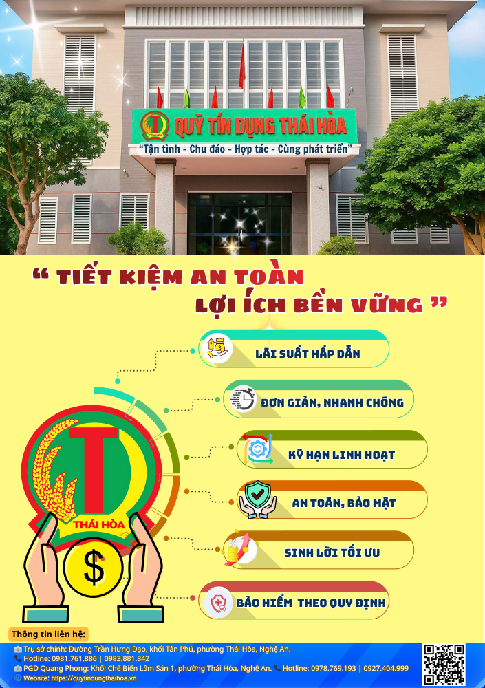 👉 Hãy để Quỹ Tín Dụng Nhân Dân Thái Hoà trở thành người bạn đồng hành đáng tin cậy trên hành trình xây dựng nền tảng tài chính vững chắc và bền lâu của bạn.