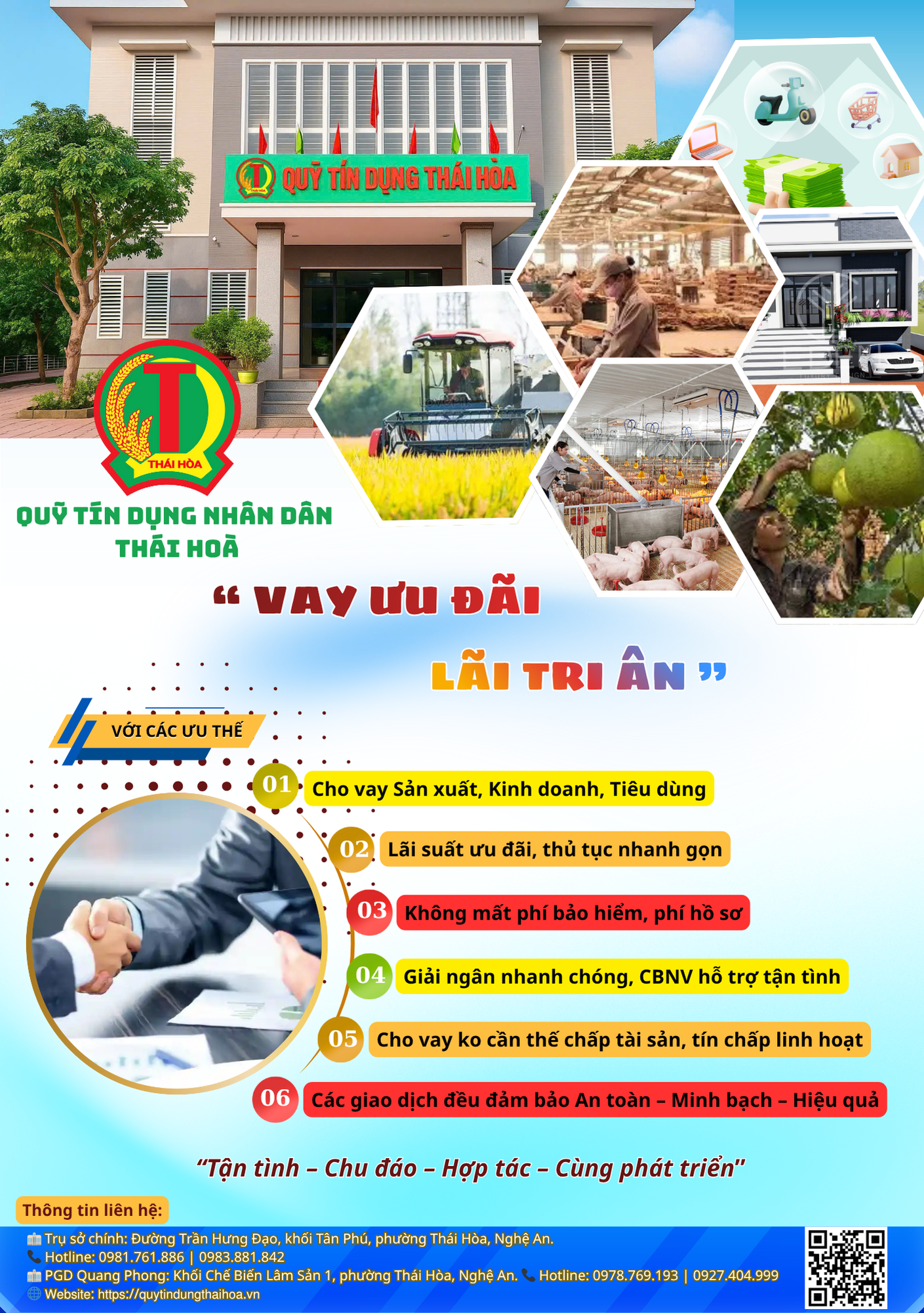 Quỹ Tín Dụng Nhân Dân Thái Hoà tự hào là địa chỉ uy tín tại Nghệ An, là điểm tựa tài chính tin cậy của người dân địa phương trong lĩnh vực huy động vốn, cho vay sản xuất – kinh doanh – tiêu dùng và cung cấp dịch vụ tài chính cộng đồng. Với phương châm “Tận tình – Chu đáo – Hợp tác cùng phát triển”, là “Nơi gửi trọn niềm tin”, chúng tôi luôn nỗ lực mang đến giải pháp tài chính an toàn, hiệu quả và phù hợp nhất cho từng khách hàng.