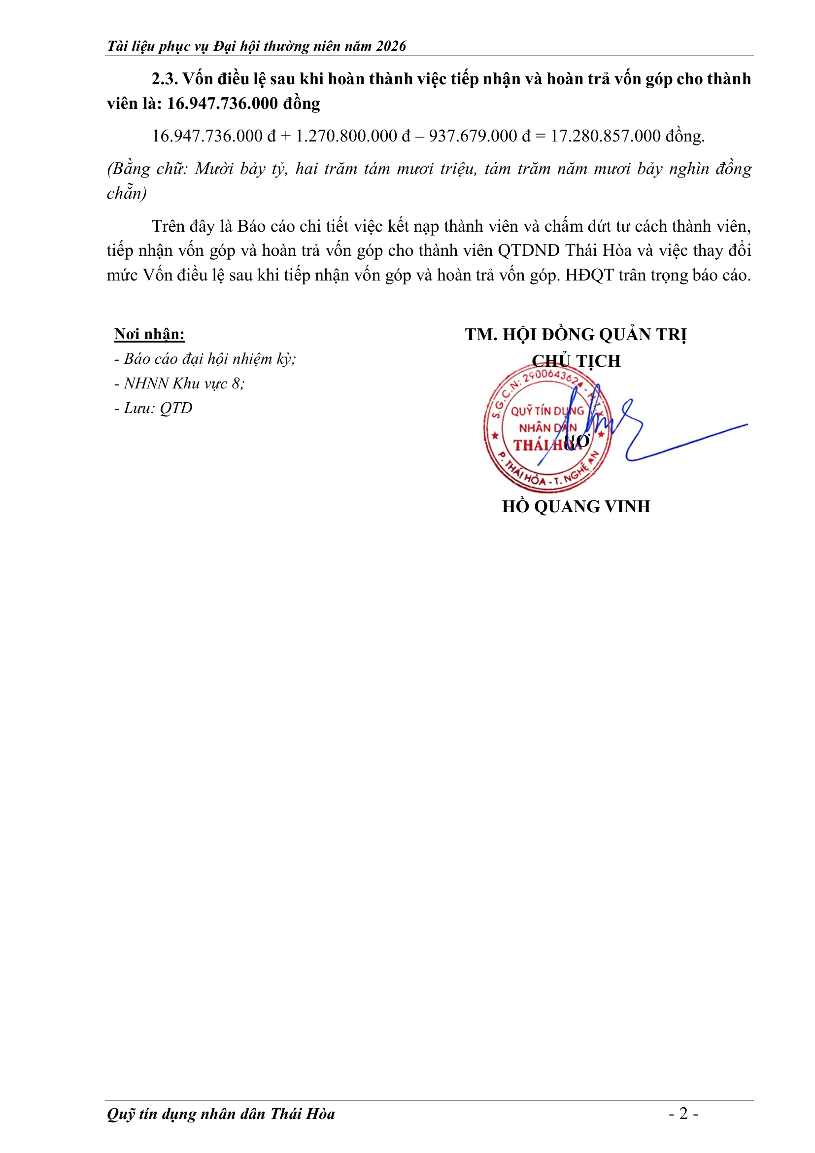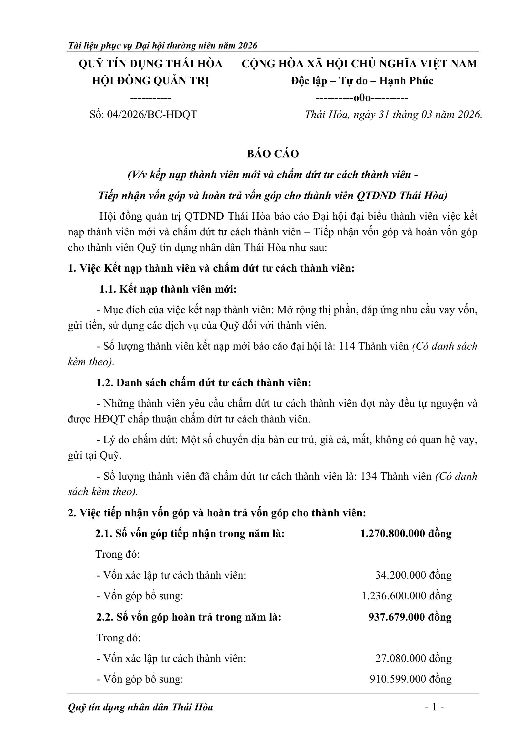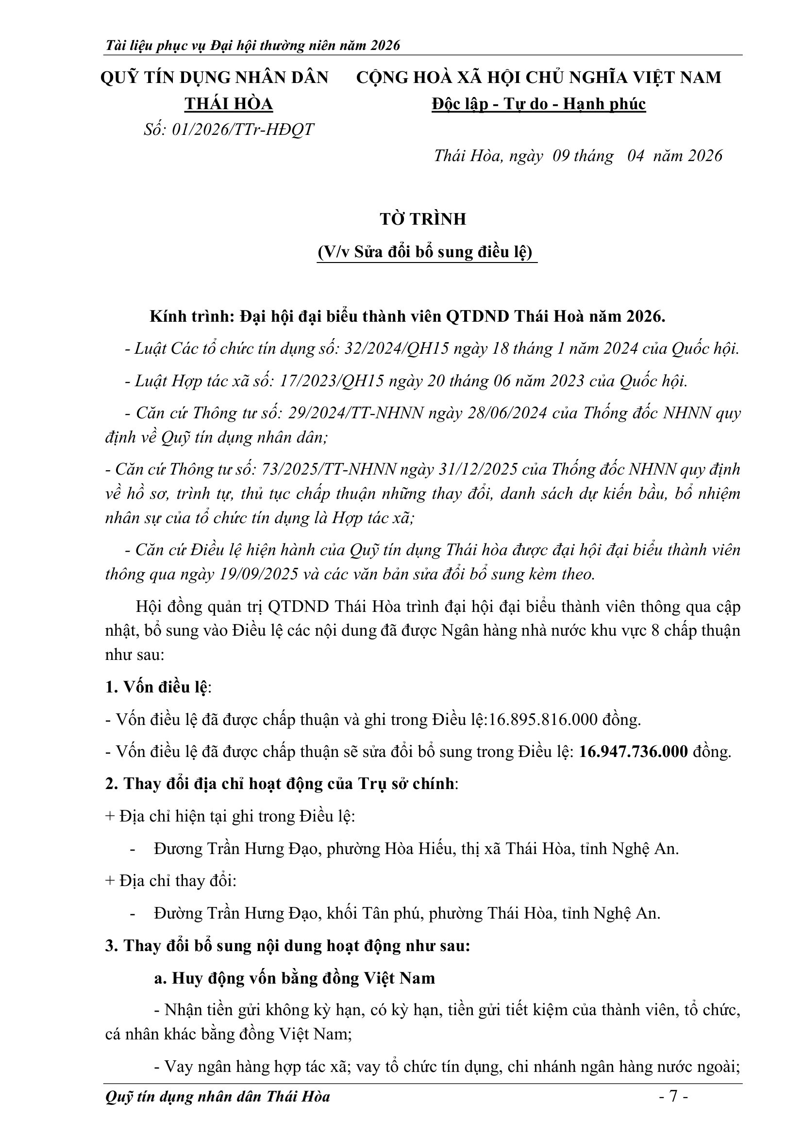 An sinh xã hội, Tin Công Đoàn, Tin khác, Tin tức, sự kiện về QTD, Tư liệu ảnh TỜ TRÌNH TẠI ĐẠI HỘI ĐẠI BIỂU THÀNH VIÊN THƯỜNG NIÊN 2026 Posted on 2 Tháng 4, 2026 by Nguyên Hoàng | Admin 02 Th4 Số lượt xem: 4 QUỸ TÍN DỤNG NHÂN DÂN THÁI HÒA Trụ sở chính: Đường Trần Hưng Đạo, khối Tân Phú, phường Hòa Hiếu, thị xã Thái Hòa, tỉnh Nghệ An. Phòng giao dịch Quang Phong: Khối Chế Biến Lâm Sản 1, phường Quang Phong, thị xã Thái Hòa, tỉnh Nghệ An. Theo dõi fanpage Bài viết mới nhất CHƯƠNG TRÌNH, NỘI QUY ĐẠI HỘI ĐẠI BIỂU THÀNH VIÊN THƯỜNG NIÊN 2026 Tài liệu phục vụ cho Đại hội Đại biểu thành viên 2026[...] 02 Th4 TỜ TRÌNH TẠI ĐẠI HỘI ĐẠI BIỂU THÀNH VIÊN THƯỜNG NIÊN 2026 Tài liệu phục vụ cho Đại hội Đại biểu thành viên 2026[...] 02 Th4 BÁO CÁO TỔNG KẾT CÔNG TÁC KIỂM SOÁT NĂM 2025 VÀ PHƯƠNG HƯỚNG NHIỆM VỤ NĂM 2026 Tài liệu phục vụ cho Đại hội Đại biểu thành viên 2026[...] 02 Th4 BÁO CÁO CÔNG TÁC TÀI CHÍNH – KẾ TOÁN NĂM 2025, KẾ HOẠCH NĂM 2026 Tài liệu phục vụ cho Đại hội Đại biểu thành viên 2026[...] 02 Th4 BÁO CÁO TỔNG KẾT HOẠT ĐỘNG NĂM 2025 – PHƯƠNG HƯỚNG NHIỆM VỤ HOẠT ĐỘNG 2026 Tài liệu phục vụ cho Đại hội Đại biểu thành viên 2026[...] 02 Th4 BÁO CÁO KẾT QUẢ THỰC HIỆN NHIỆM VỤ CỦA HĐQT NĂM 2025 – PHƯƠNG HƯỚNG NHIỆM VỤ NĂM 2026 Tài liệu phục vụ cho Đại hội Đại biểu thành viên 2026[...] 02 Th4 Quỹ tín dụng Nhân dân Thái Hòa tích cực tuyên truyền hưởng ứng Ngày bầu cử Quốc hội khóa XVI và HĐND các cấp Số lượt xem: 226 Hướng tới Ngày bầu cử Đại biểu Quốc hội khóa XVI[...] 12 Th3 QUỸ TÍN DỤNG NHÂN DÂN THÁI HÒA ÁP DỤNG GÓI LÃI SUẤT TIẾT KIỆM MỚI CAO NHẤT THỊ TRƯỜNG – LÊN ĐẾN 𝟕,𝟓%/NĂM Số lượt xem: 310 QUỸ TÍN DỤNG NHÂN DÂN THÁI HÒA ÁP DỤNG GÓI LÃI[...] 08 Th3 Quỹ Tín dụng Nhân dân Thái Hòa hưởng ứng Tuần lễ Áo dài Việt Nam chào mừng Ngày Quốc tế Phụ nữ 08/3 Số lượt xem: 185 Chuyên mục: Tuyên truyền – Hoạt động đoàn thểNgày đăng: 08/03/2026Tác[...] 06 Th3 🌸 KHỞI ĐẦU XUÂN NĂM MỚI 2026: QUỸ TÍN DỤNG NHÂN DÂN THÁI HÒA TRIỂN KHAI NHIỀU ƯU ĐÃI HẤP DẪN Số lượt xem: 322 Bước sang Xuân Bính Ngọ 2026 với khí thế mới và[...] 23 Th2 THÔNG BÁO LỊCH NGHỈ TẾT NGUYÊN ĐÁN 2026 Số lượt xem: 213 📢 THÔNG BÁO LỊCH NGHỈ TẾT NGUYÊN ĐÁN 2026 🧧 Quỹ[...] 10 Th2 NGÂN HÀNG HỢP TÁC XÃ CHI NHÁNH NGHỆ AN ĐẾN THĂM, CHÚC TẾT QUỸ TÍN DỤNG NHÂN DÂN THÁI HÒA Số lượt xem: 311 🌸 NGÂN HÀNG HỢP TÁC XÃ CHI NHÁNH NGHỆ AN ĐẾN[...] 02 Th2 Chia sẻ Nguyên Hoàng | Admin BÁO CÁO TỔNG KẾT CÔNG TÁC KIỂM SOÁT NĂM 2025 VÀ PHƯƠNG HƯỚNG NHIỆM VỤ NĂM 2026 CHƯƠNG TRÌNH, NỘI QUY ĐẠI HỘI ĐẠI BIỂU THÀNH VIÊN THƯỜNG NIÊN 2026