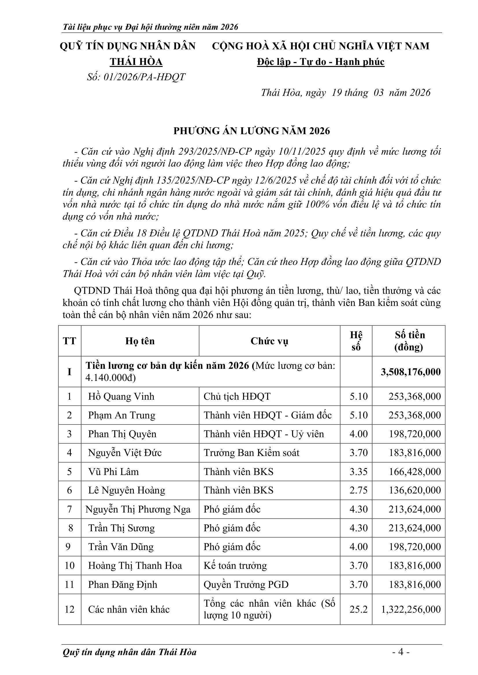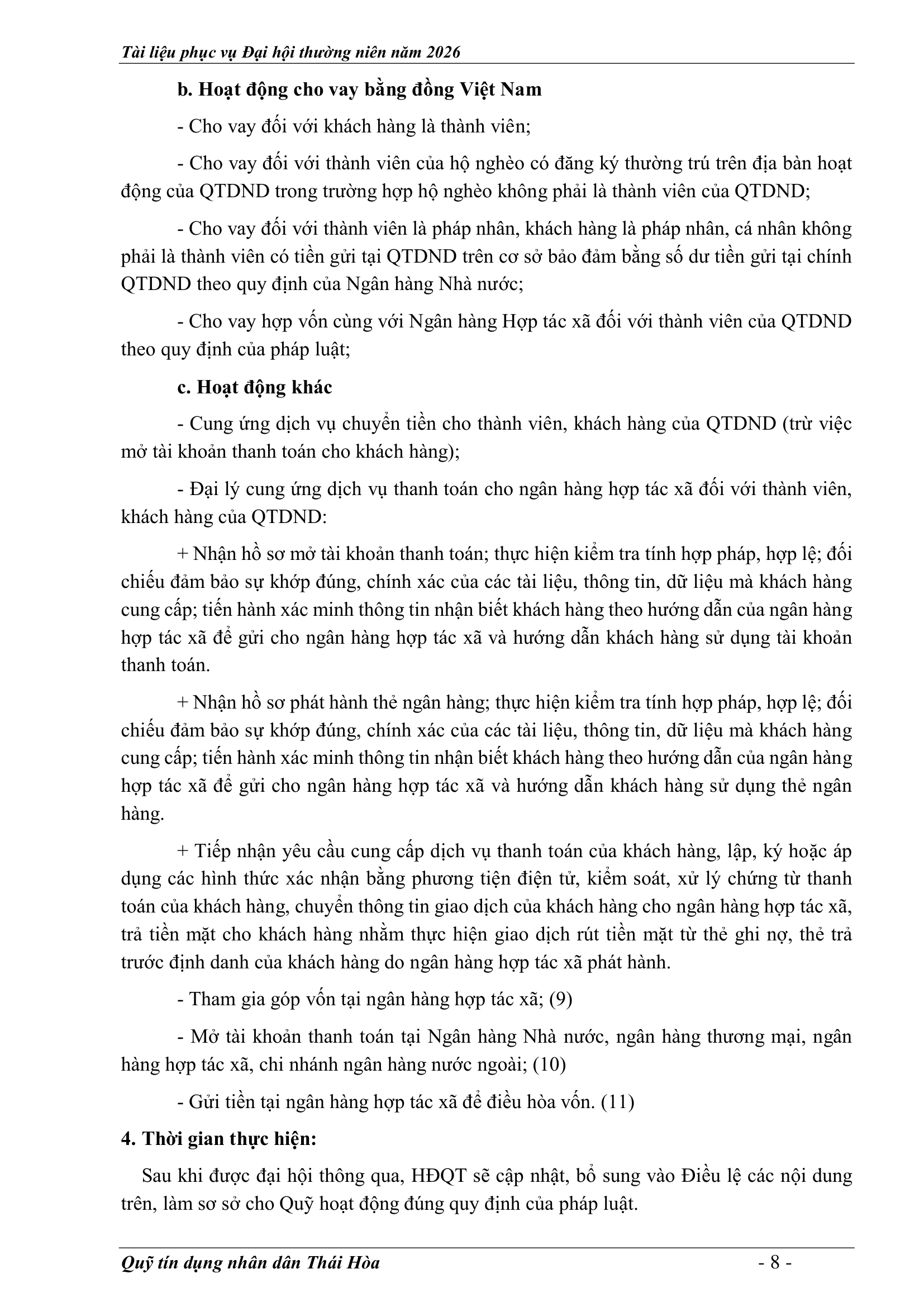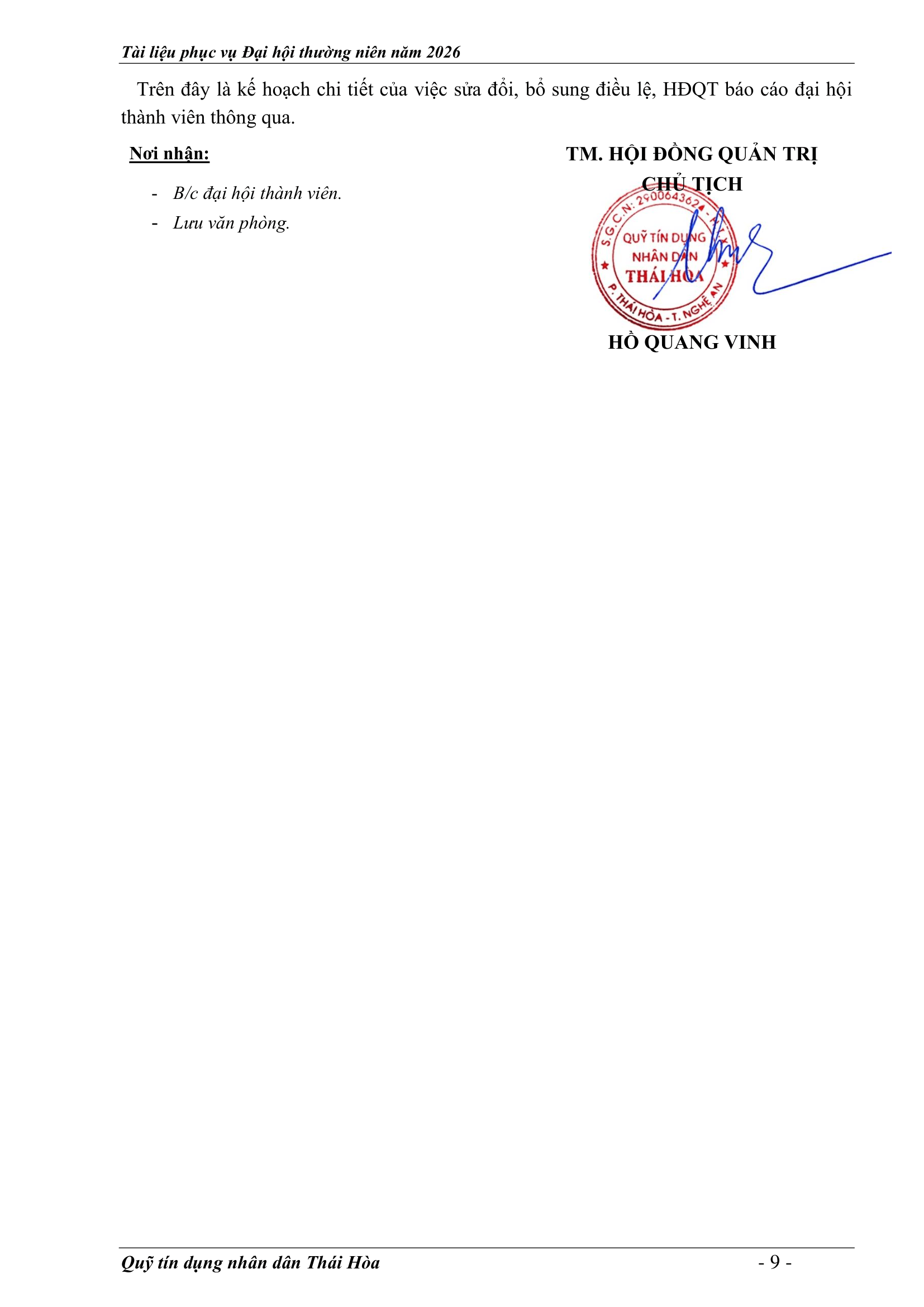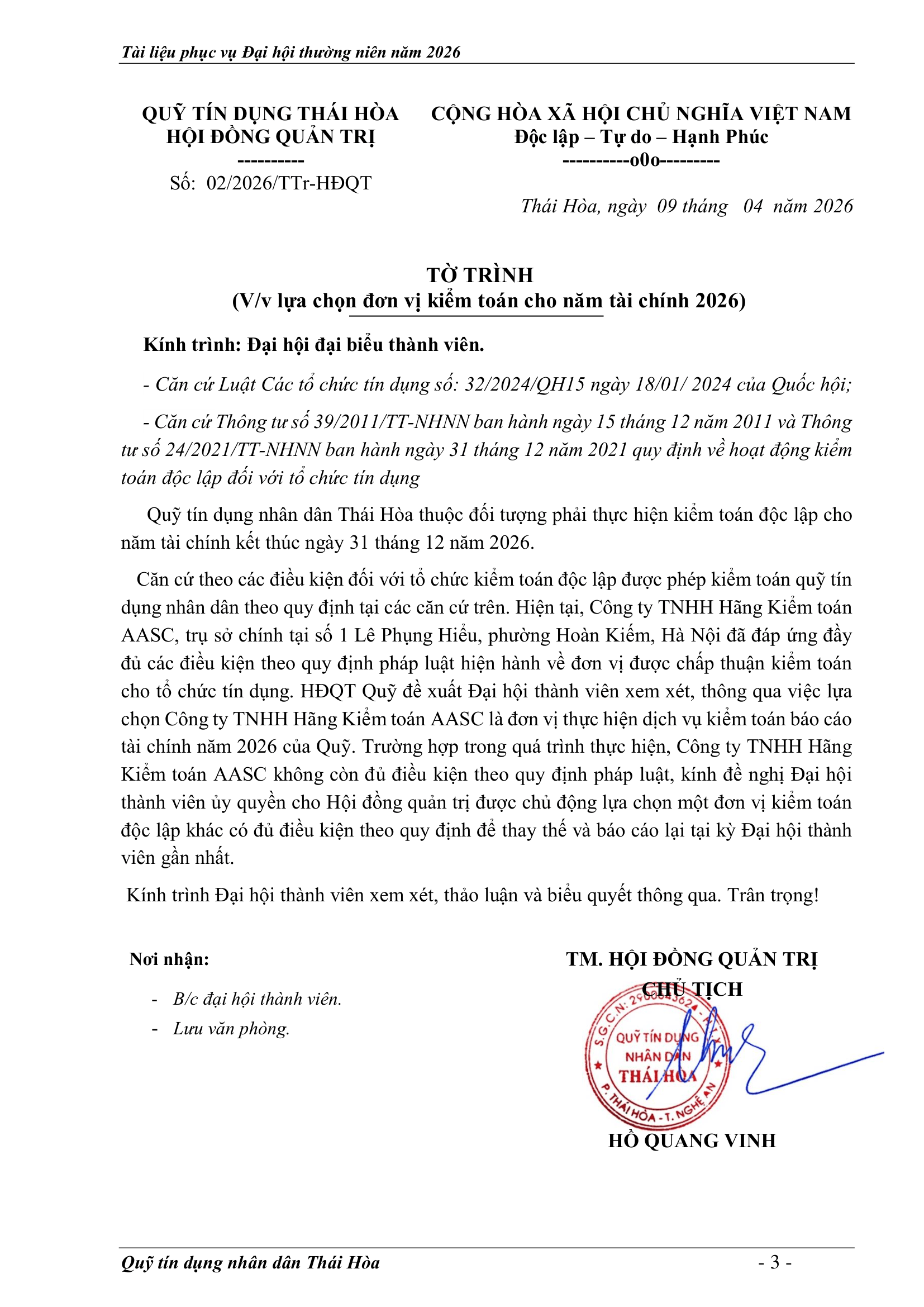 An sinh xã hội, Tin Công Đoàn, Tin khác, Tin tức, sự kiện về QTD, Tư liệu ảnh TỜ TRÌNH TẠI ĐẠI HỘI ĐẠI BIỂU THÀNH VIÊN THƯỜNG NIÊN 2026 Posted on 2 Tháng 4, 2026 by Nguyên Hoàng | Admin 02 Th4 Số lượt xem: 4 QUỸ TÍN DỤNG NHÂN DÂN THÁI HÒA Trụ sở chính: Đường Trần Hưng Đạo, khối Tân Phú, phường Hòa Hiếu, thị xã Thái Hòa, tỉnh Nghệ An. Phòng giao dịch Quang Phong: Khối Chế Biến Lâm Sản 1, phường Quang Phong, thị xã Thái Hòa, tỉnh Nghệ An. Theo dõi fanpage Bài viết mới nhất CHƯƠNG TRÌNH, NỘI QUY ĐẠI HỘI ĐẠI BIỂU THÀNH VIÊN THƯỜNG NIÊN 2026 Tài liệu phục vụ cho Đại hội Đại biểu thành viên 2026[...] 02 Th4 TỜ TRÌNH TẠI ĐẠI HỘI ĐẠI BIỂU THÀNH VIÊN THƯỜNG NIÊN 2026 Tài liệu phục vụ cho Đại hội Đại biểu thành viên 2026[...] 02 Th4 BÁO CÁO TỔNG KẾT CÔNG TÁC KIỂM SOÁT NĂM 2025 VÀ PHƯƠNG HƯỚNG NHIỆM VỤ NĂM 2026 Tài liệu phục vụ cho Đại hội Đại biểu thành viên 2026[...] 02 Th4 BÁO CÁO CÔNG TÁC TÀI CHÍNH – KẾ TOÁN NĂM 2025, KẾ HOẠCH NĂM 2026 Tài liệu phục vụ cho Đại hội Đại biểu thành viên 2026[...] 02 Th4 BÁO CÁO TỔNG KẾT HOẠT ĐỘNG NĂM 2025 – PHƯƠNG HƯỚNG NHIỆM VỤ HOẠT ĐỘNG 2026 Tài liệu phục vụ cho Đại hội Đại biểu thành viên 2026[...] 02 Th4 BÁO CÁO KẾT QUẢ THỰC HIỆN NHIỆM VỤ CỦA HĐQT NĂM 2025 – PHƯƠNG HƯỚNG NHIỆM VỤ NĂM 2026 Tài liệu phục vụ cho Đại hội Đại biểu thành viên 2026[...] 02 Th4 Quỹ tín dụng Nhân dân Thái Hòa tích cực tuyên truyền hưởng ứng Ngày bầu cử Quốc hội khóa XVI và HĐND các cấp Số lượt xem: 226 Hướng tới Ngày bầu cử Đại biểu Quốc hội khóa XVI[...] 12 Th3 QUỸ TÍN DỤNG NHÂN DÂN THÁI HÒA ÁP DỤNG GÓI LÃI SUẤT TIẾT KIỆM MỚI CAO NHẤT THỊ TRƯỜNG – LÊN ĐẾN 𝟕,𝟓%/NĂM Số lượt xem: 310 QUỸ TÍN DỤNG NHÂN DÂN THÁI HÒA ÁP DỤNG GÓI LÃI[...] 08 Th3 Quỹ Tín dụng Nhân dân Thái Hòa hưởng ứng Tuần lễ Áo dài Việt Nam chào mừng Ngày Quốc tế Phụ nữ 08/3 Số lượt xem: 185 Chuyên mục: Tuyên truyền – Hoạt động đoàn thểNgày đăng: 08/03/2026Tác[...] 06 Th3 🌸 KHỞI ĐẦU XUÂN NĂM MỚI 2026: QUỸ TÍN DỤNG NHÂN DÂN THÁI HÒA TRIỂN KHAI NHIỀU ƯU ĐÃI HẤP DẪN Số lượt xem: 322 Bước sang Xuân Bính Ngọ 2026 với khí thế mới và[...] 23 Th2 THÔNG BÁO LỊCH NGHỈ TẾT NGUYÊN ĐÁN 2026 Số lượt xem: 213 📢 THÔNG BÁO LỊCH NGHỈ TẾT NGUYÊN ĐÁN 2026 🧧 Quỹ[...] 10 Th2 NGÂN HÀNG HỢP TÁC XÃ CHI NHÁNH NGHỆ AN ĐẾN THĂM, CHÚC TẾT QUỸ TÍN DỤNG NHÂN DÂN THÁI HÒA Số lượt xem: 311 🌸 NGÂN HÀNG HỢP TÁC XÃ CHI NHÁNH NGHỆ AN ĐẾN[...] 02 Th2 Chia sẻ Nguyên Hoàng | Admin BÁO CÁO TỔNG KẾT CÔNG TÁC KIỂM SOÁT NĂM 2025 VÀ PHƯƠNG HƯỚNG NHIỆM VỤ NĂM 2026 CHƯƠNG TRÌNH, NỘI QUY ĐẠI HỘI ĐẠI BIỂU THÀNH VIÊN THƯỜNG NIÊN 2026